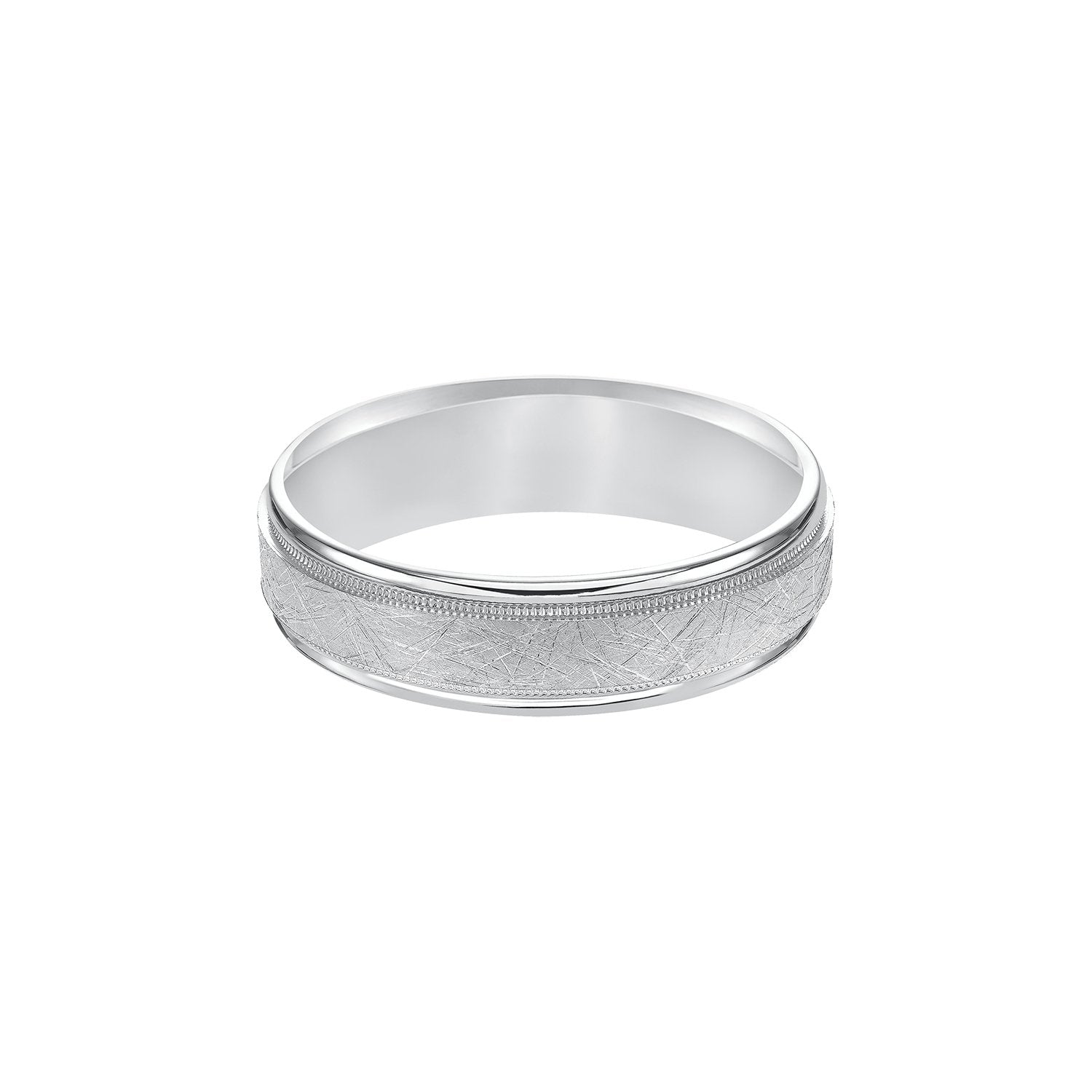 This comfort fit 6mm band is crafted from 14k white gold with an etched crystalline finish, milgrain trim, and polished edges.