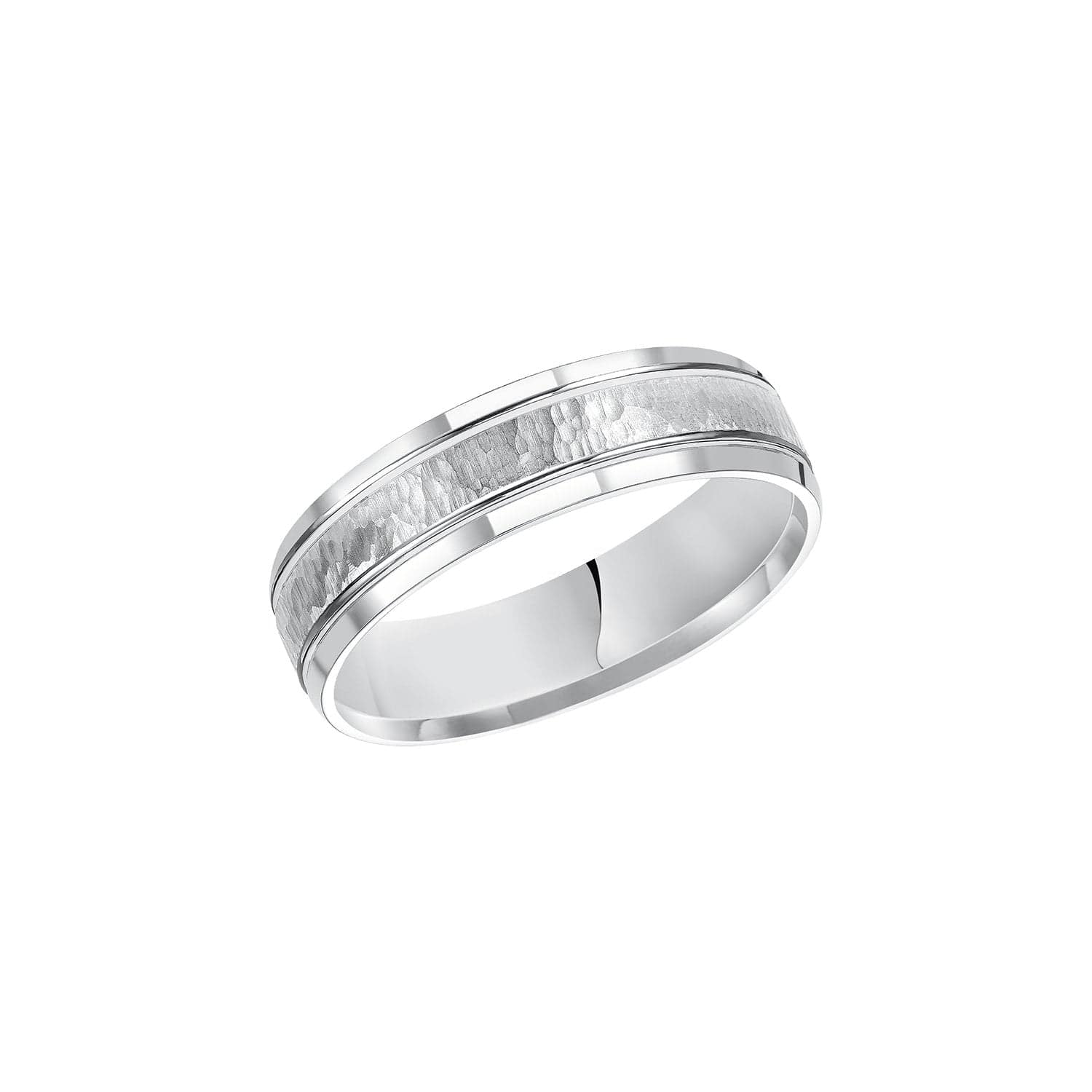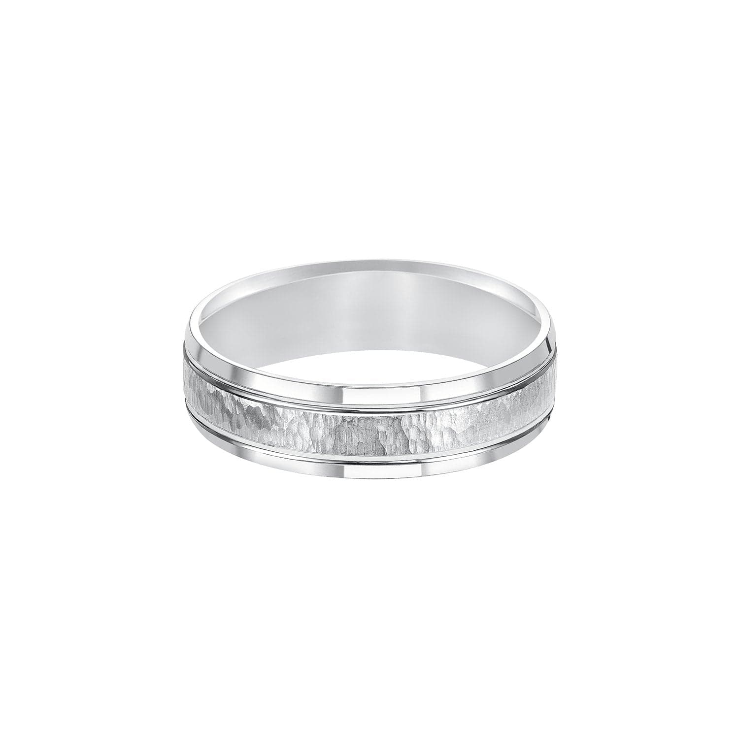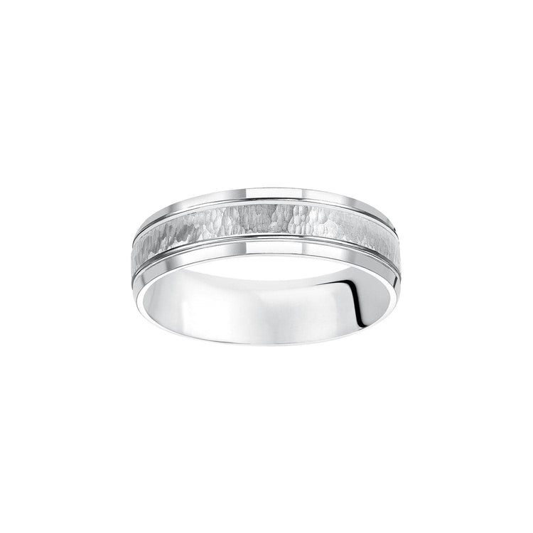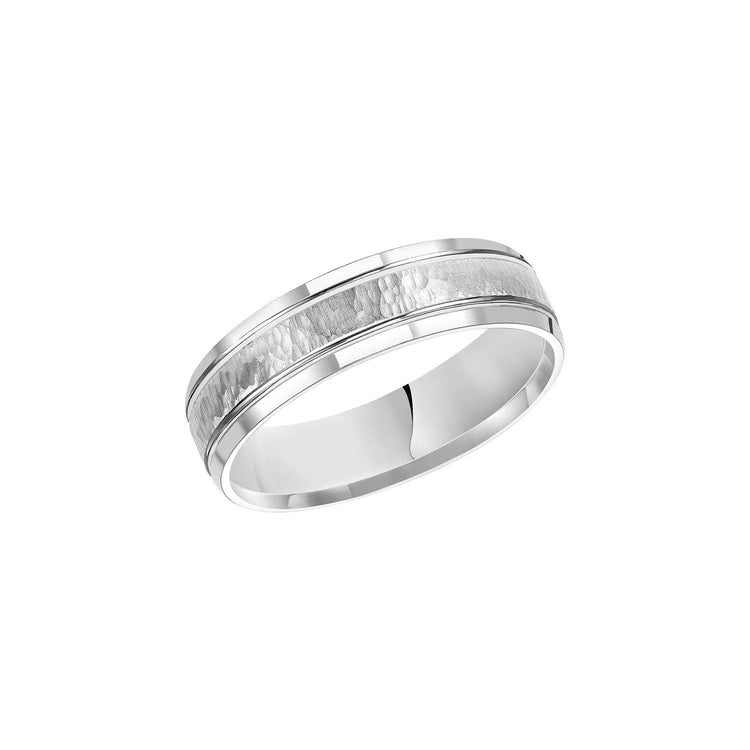 This comfort fit 6mm band is crafted from 14k white gold with a tumble rock finish center accented by step edges leading to polished rims.