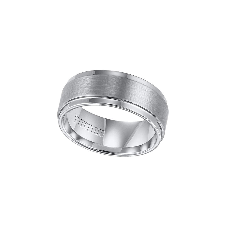 This comfort fit 9mm band, is crafted from white tungsten carbide with a brushed finish and bright step edges.
