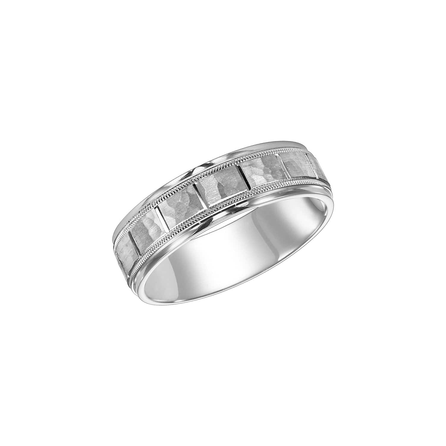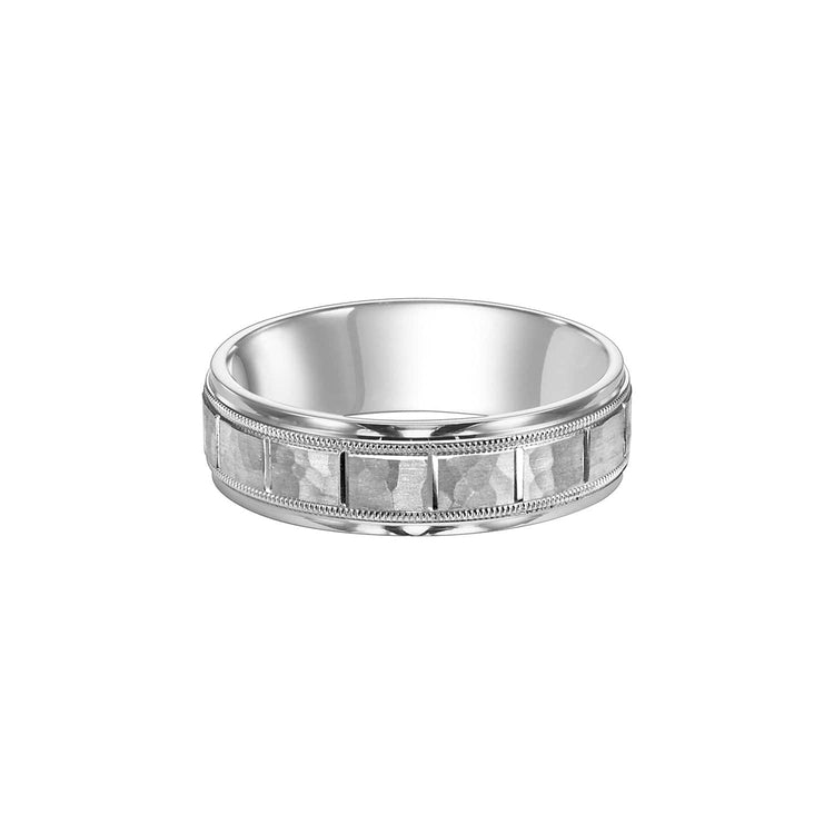 This comfort fit 6.5mm band features a satin hammer finish with vertical cuts and milgrain trim for a modern fusion of traditional details.