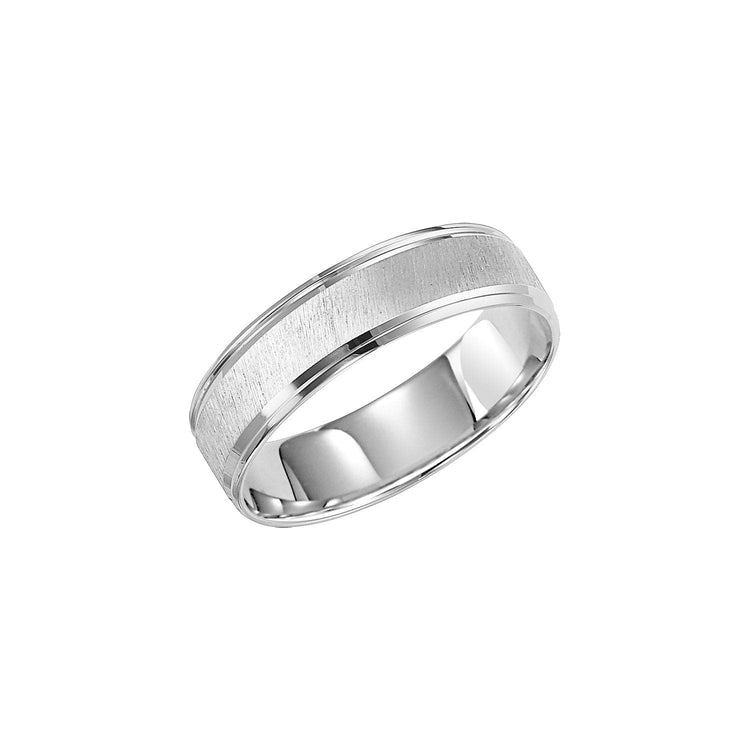 This comfort fit 6mm band, crafted from 14k white gold, features a diagonal satin finish with stepped edges offering a refreshing look that will last a lifetime.
