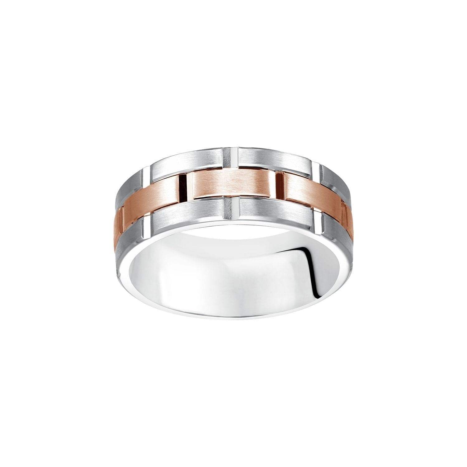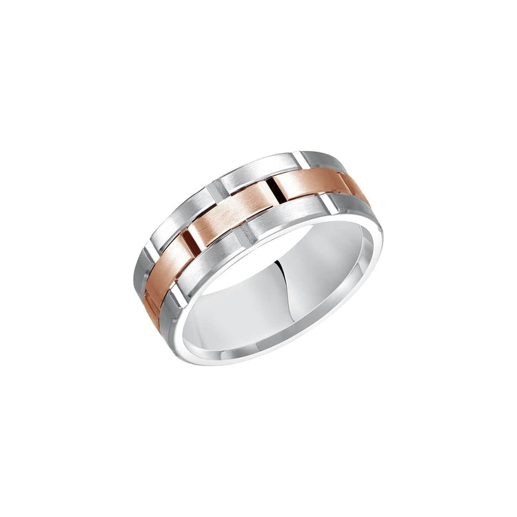 This innovative, matrix-inspired two-tone comfort fit 8mm band is crafted from 14k gold and features a flat, satin finish with vertical cuts and beveled edges.