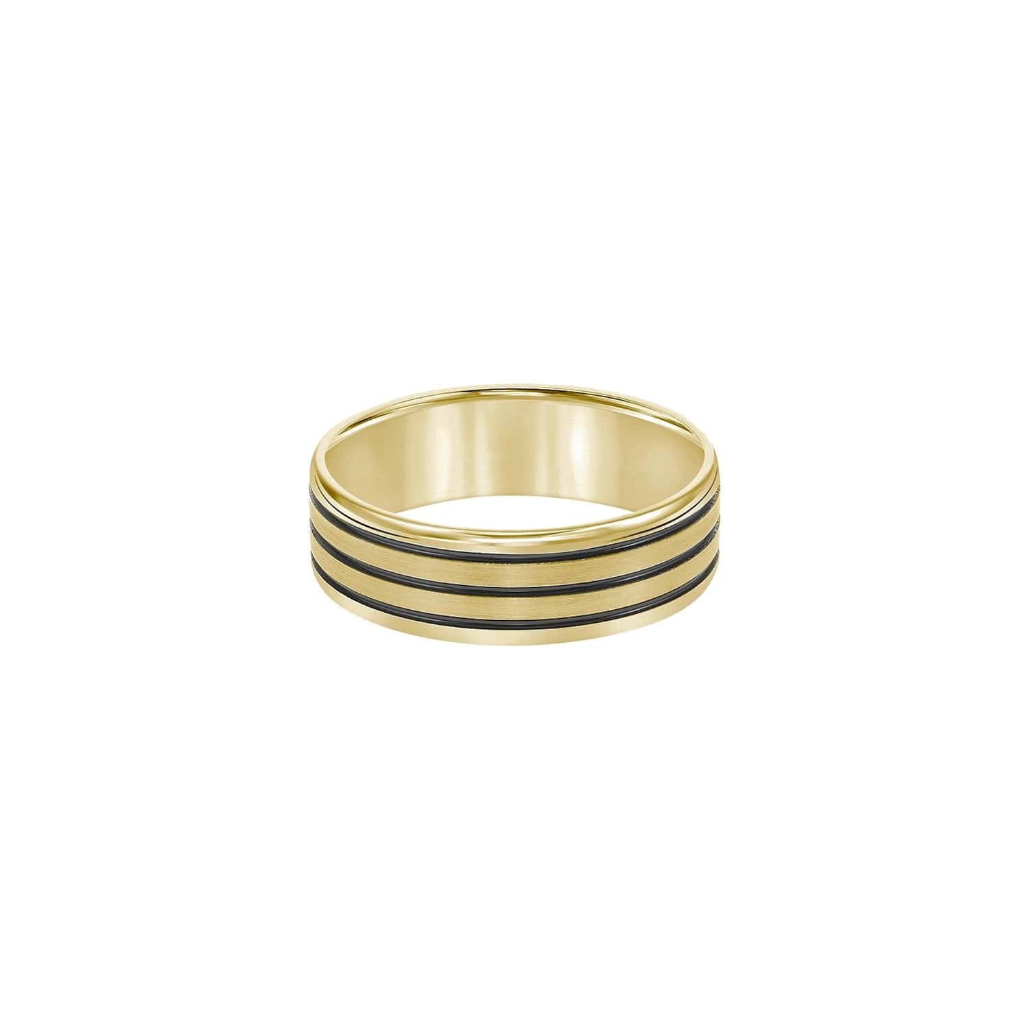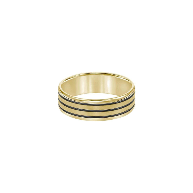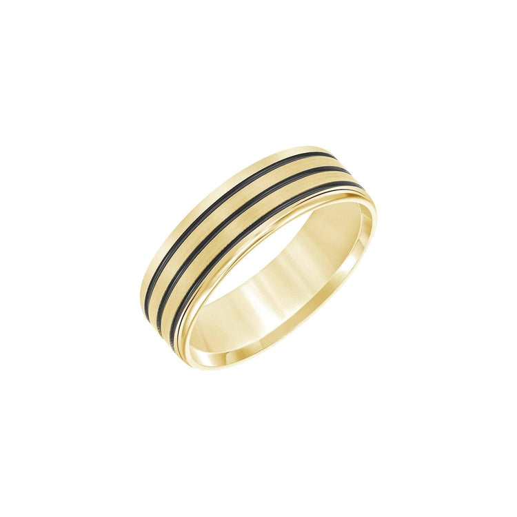 This comfort fit 7mm band is crafted from 14k yellow gold with a brushed finish, three black epoxy center stripes, and round polished edges.