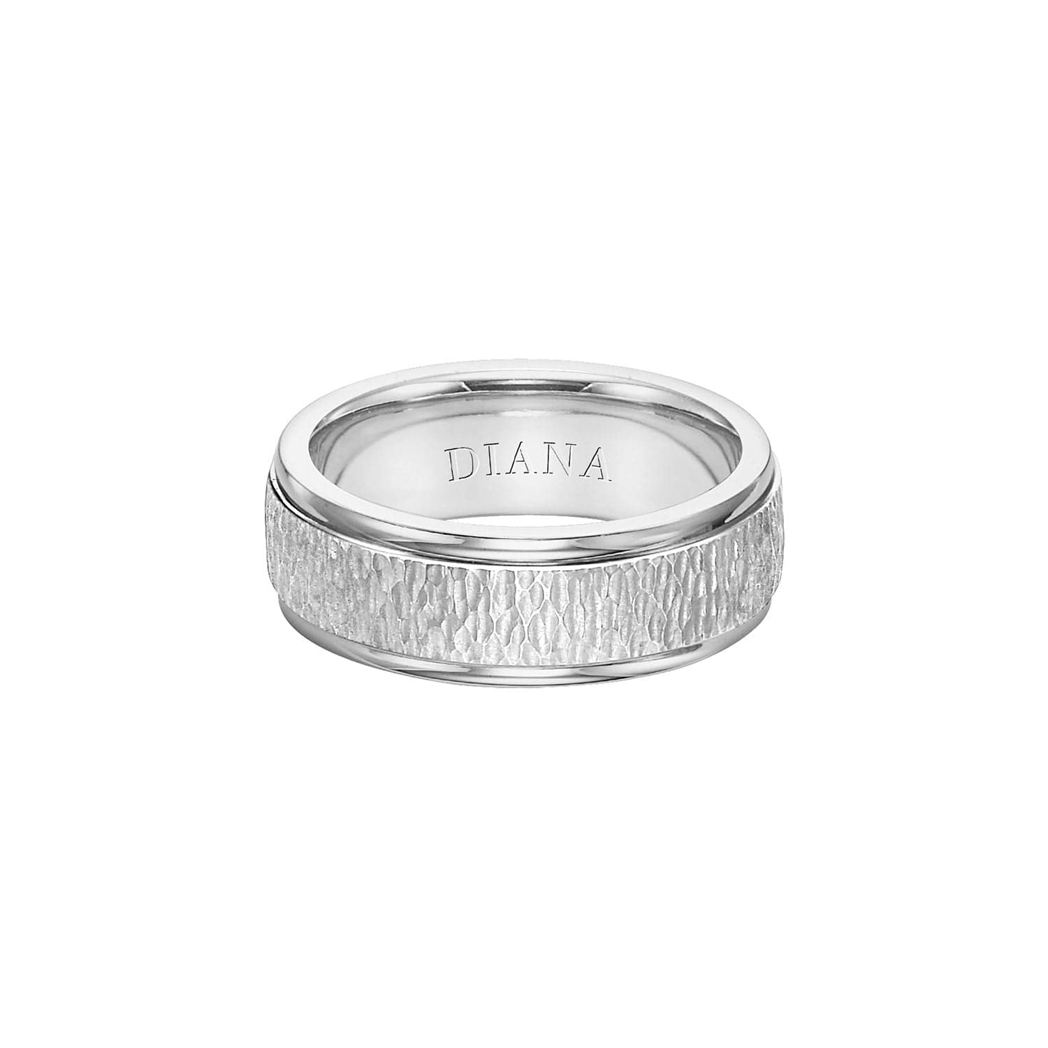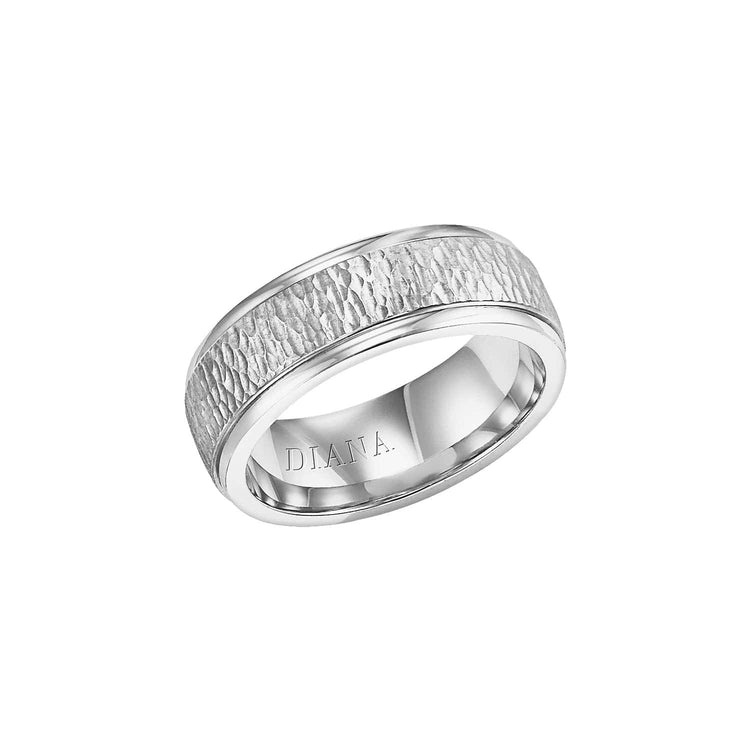 This comfort fit 7.5mm band is crafted from 14k white gold with a hammered finished center framed by polished, recessed edges.