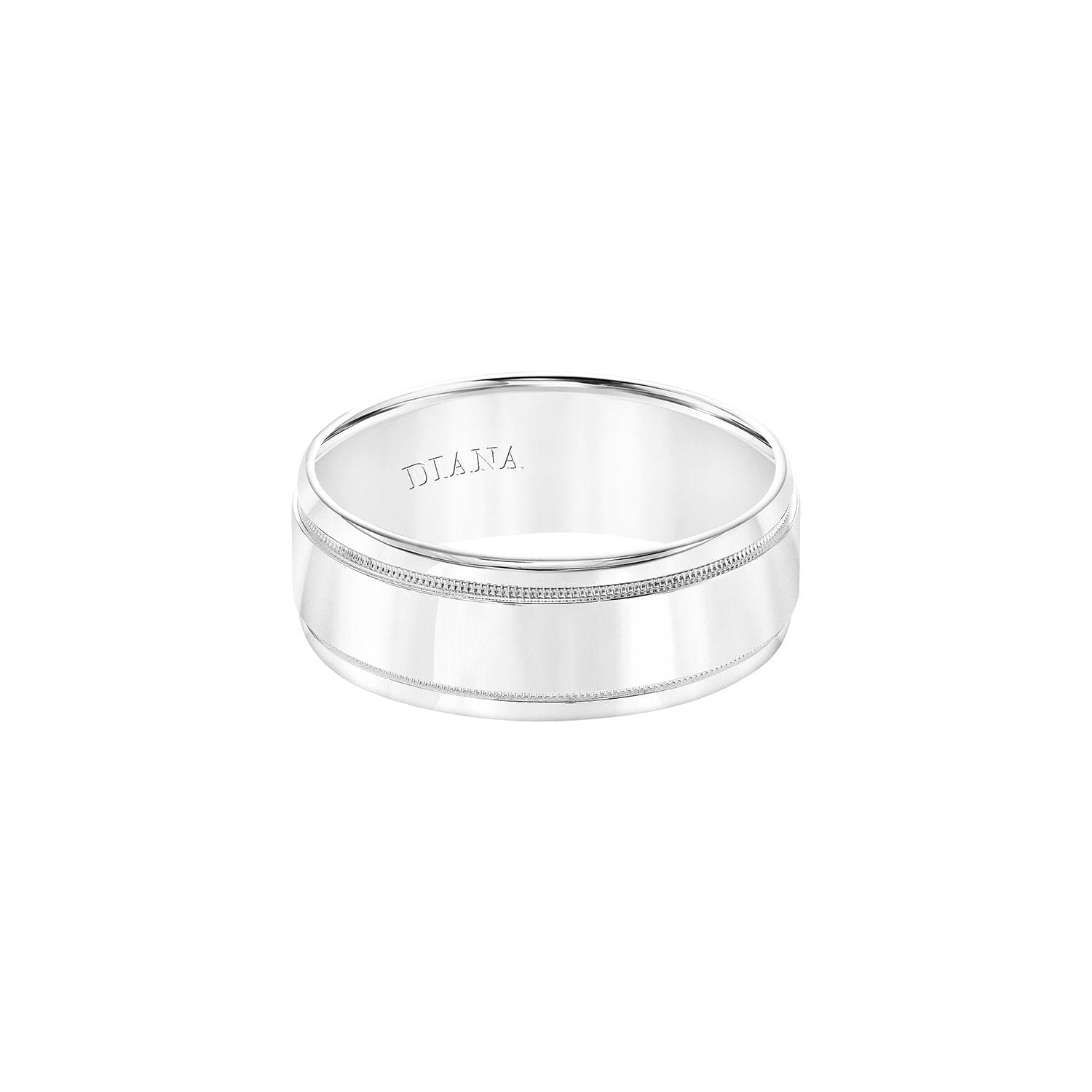 This comfort fit 8mm band is crafted from platinum with a ribbed edge and milgrain detailing.