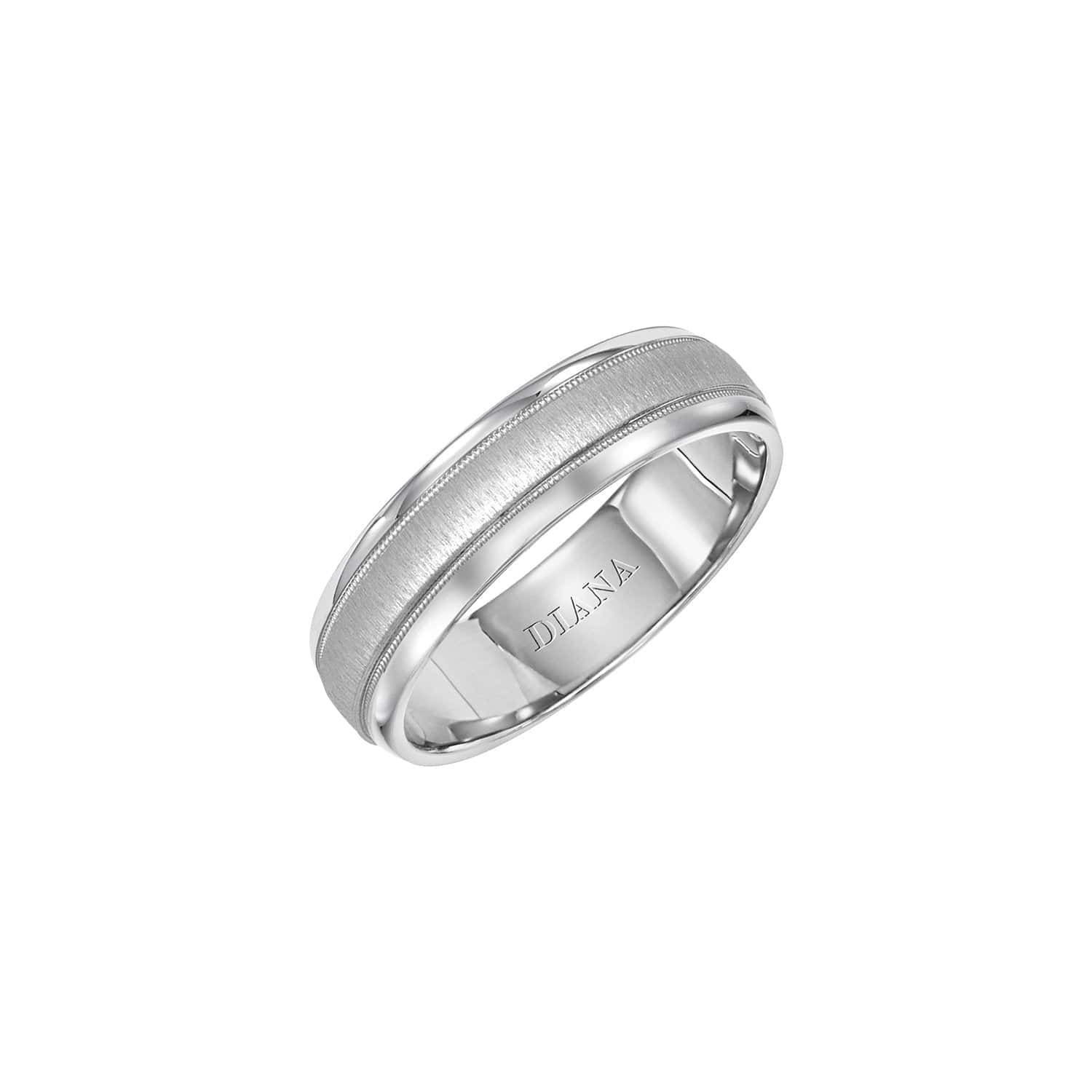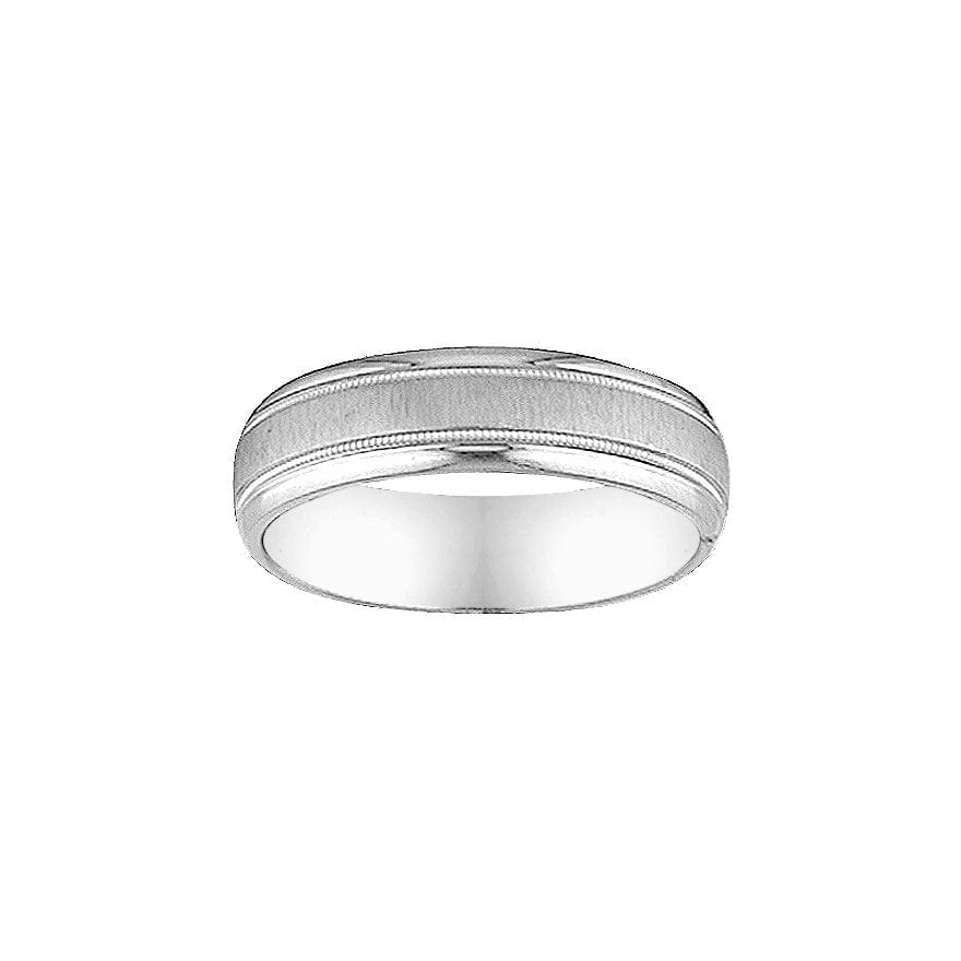 This comfort fit 6mm band is crafted from 14k white gold with a vertical satin finish center trimmed with milgrain detailing and framed by polished edges.