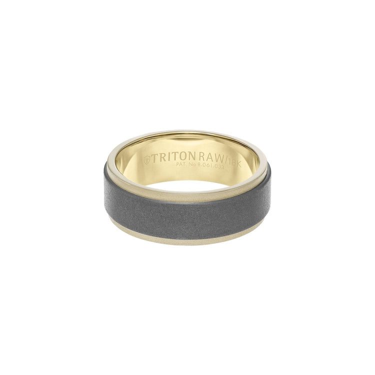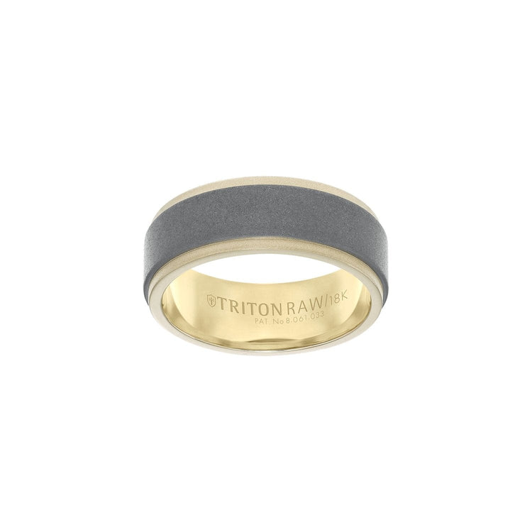This flat profile 8mm band is crafted from 18k yellow gold with step edges and has an innovative RAW matte insert exterior.