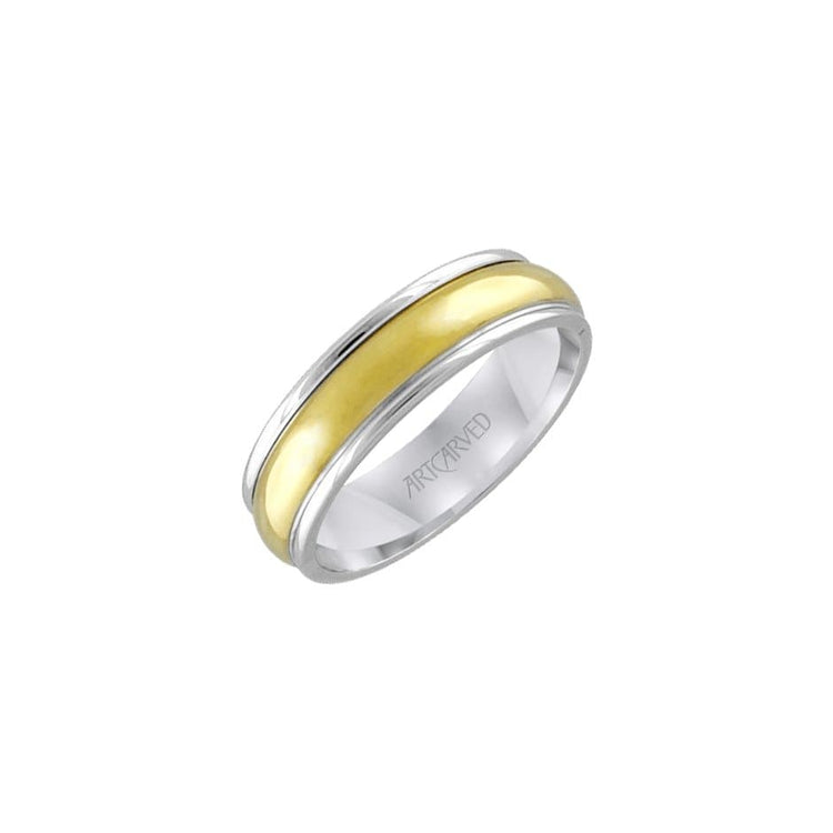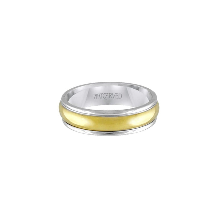 This two-tone Harrison 6mm band, designed by Artcarved, features a polished 14k yellow gold domed center with 14k white gold polished, beveled edges.