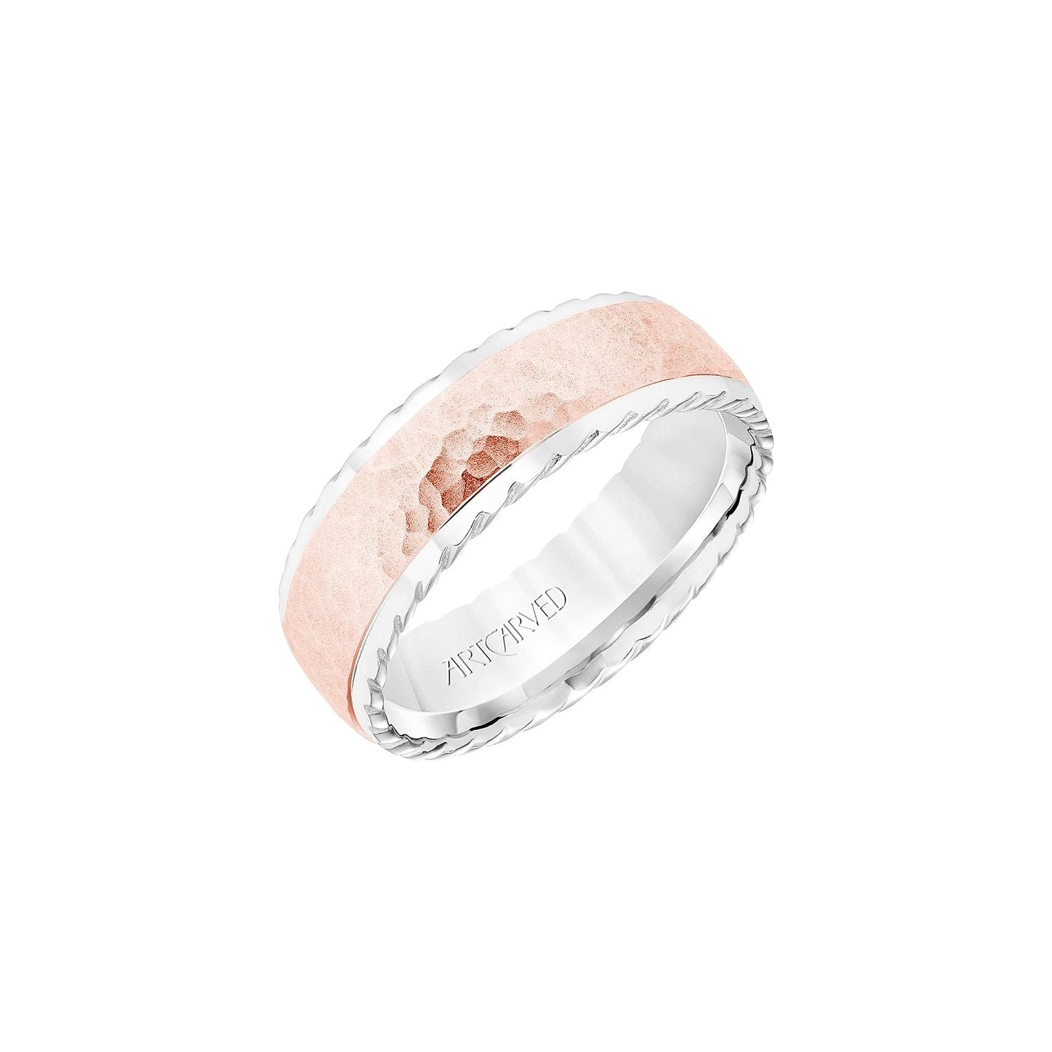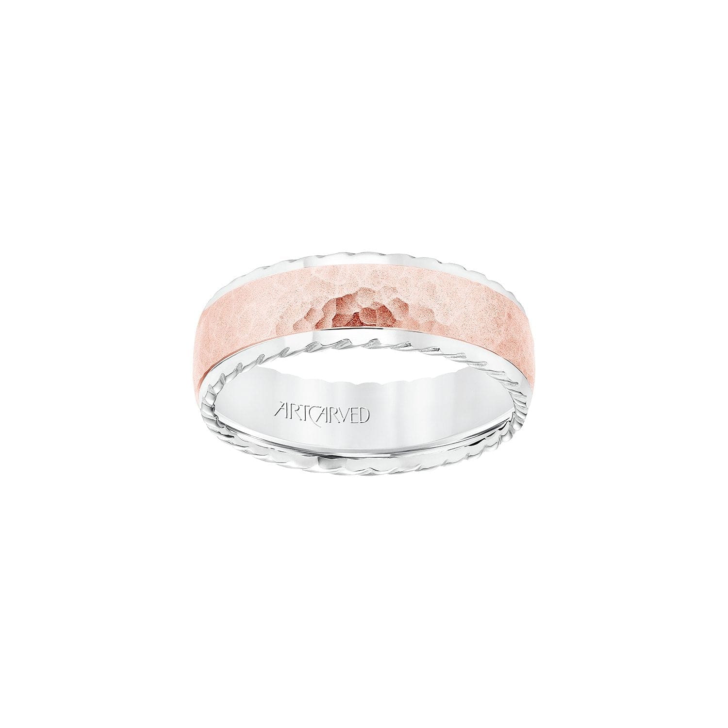 This dome profile, comfort fit 7mm band is crafted from 14k rose and white gold with a hammered finish center and rope edge detailing.