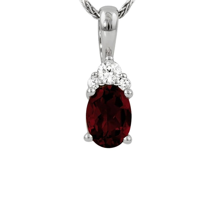 Elevate your style with our lovely Garnet and Diamond Pendant. Skillfully crafted from 14k white gold, a graceful oval garnet takes center stage, radiating warmth and sophistication. Sparkling round brilliant diamonds add a touch of glamour to this timeless piece. A must-have for any jewelry collection.