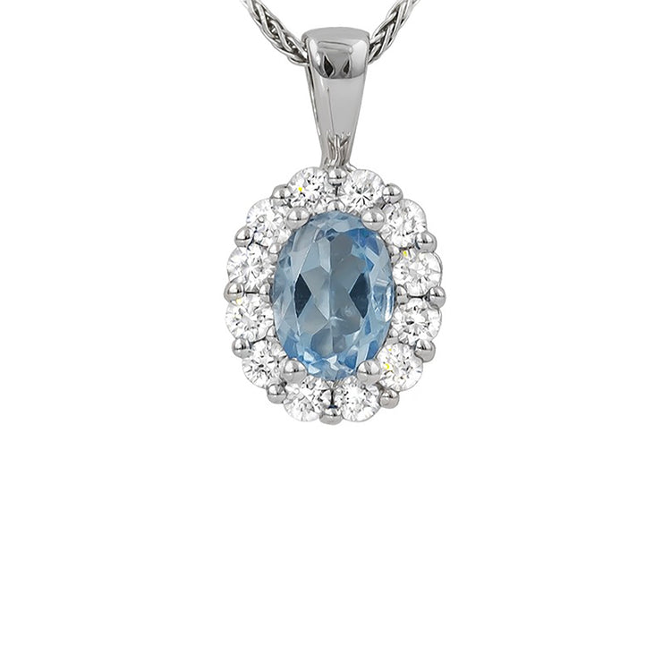 Indulge yourself or a loved one with our stunning Aquamarine & Diamond Halo Necklace. The 14k white gold setting showcases a mesmerizing oval aquamarine surrounded by dazzling diamonds. Elevate any outfit with this magical pendant.