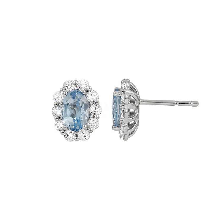 Indulge yourself or a loved one with our stunning Aquamarine & Diamond Halo Earrings. The 14k white gold setting showcases mesmerizing oval aquamarine stones surrounded by dazzling diamonds. Elevate any outfit with these magical earrings.