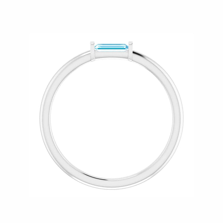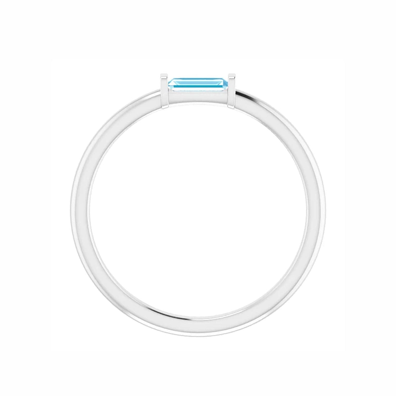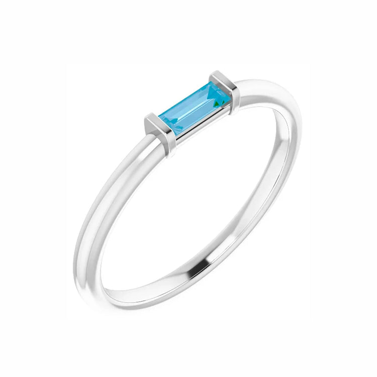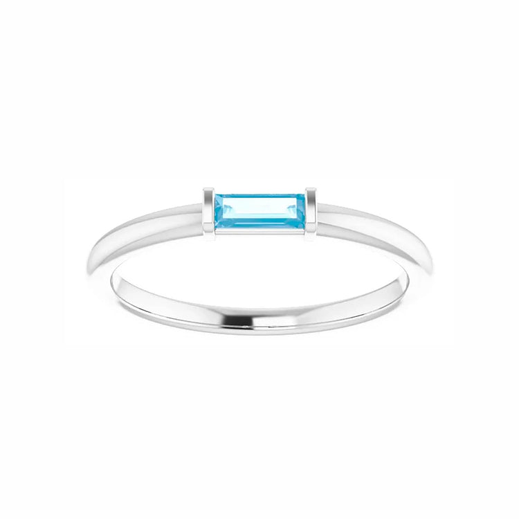 Crafted from 14k white gold and featuring a beautiful Swiss blue topaz baguette, this stackable stunner is perfect for layering with your favorite ring stacks—or wearing solo for a subtle pop of color.