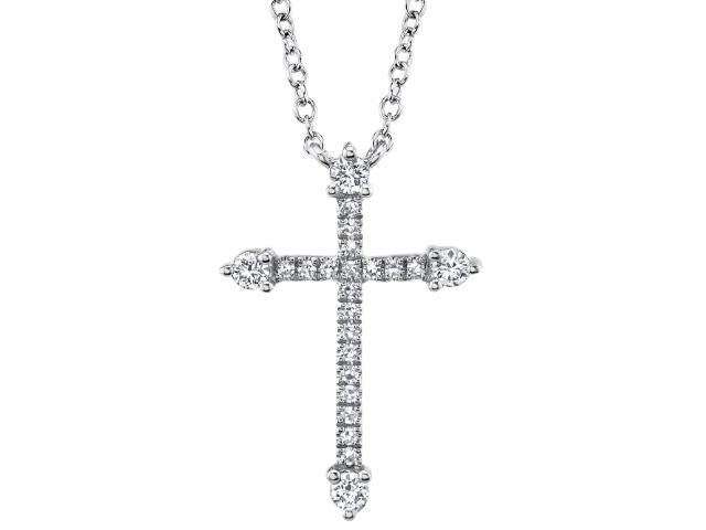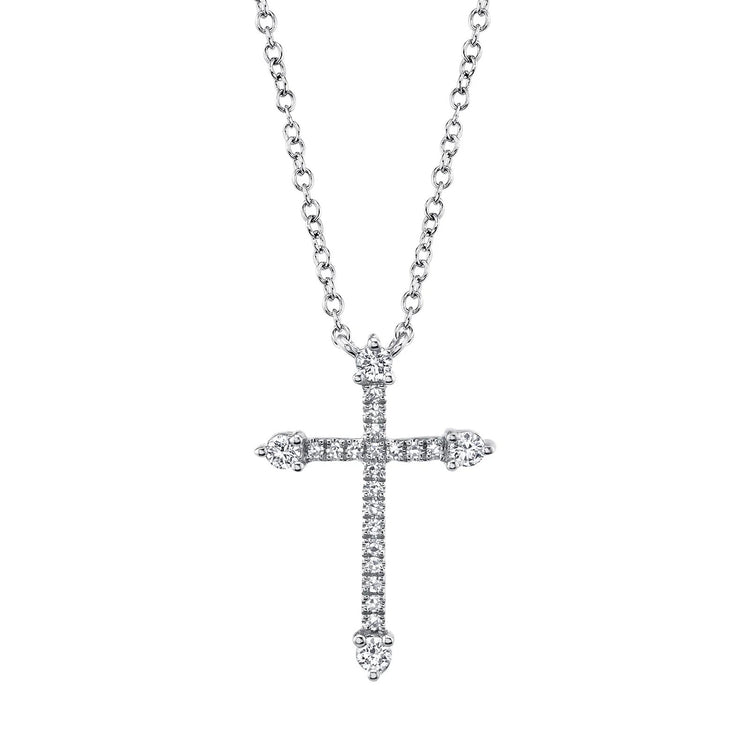This striking cross necklace, crafted from 14k white gold, is set with round brilliant diamonds and accented with larger round brilliant diamonds on the ends.