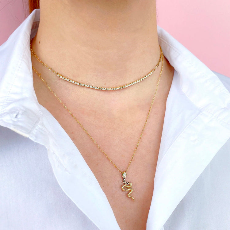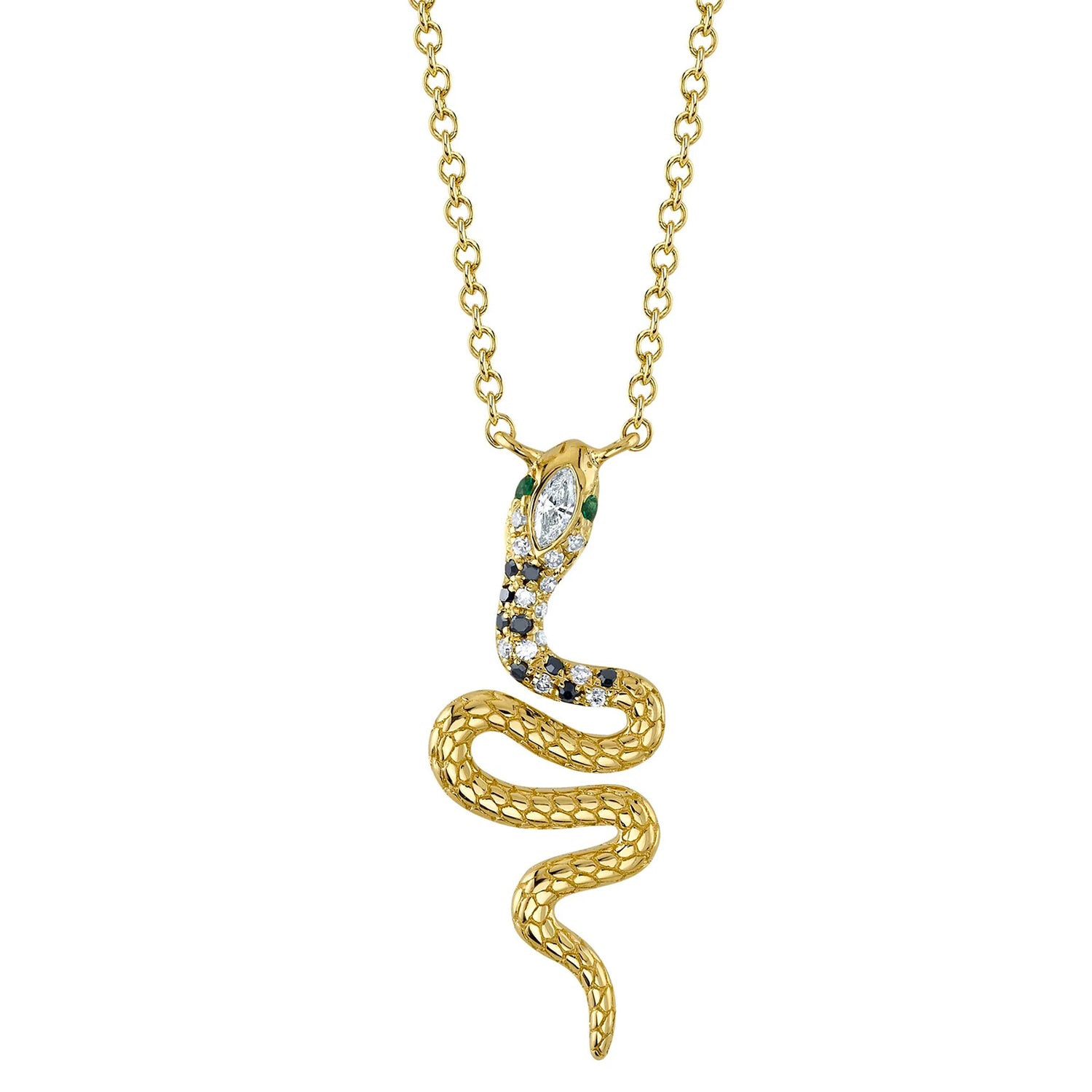 Be bold and unique with Shy Creation's Diamond, Black Diamond, and Emerald Snake Necklace. Crafted with 14k yellow gold, this pendant features a marquise shaped diamond with two emeralds acting as eyes, round black diamonds, and brilliant round diamonds, creating an exquisite piece for your wardrobe. Unleash your inner glamour and let your style slither through the night.