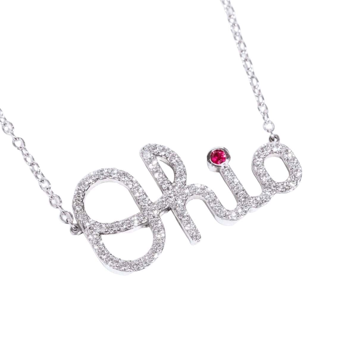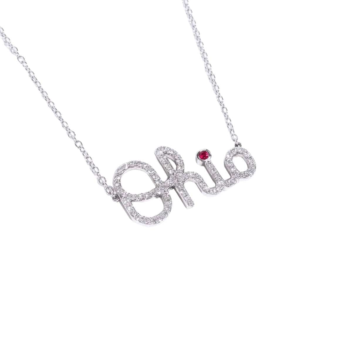 Show your support for The Ohio State Buckeyes this football season by sporting this beautifully crafted Diamond Script Ohio necklace. Made from 14K white gold adorned with diamonds and a scarlet accent ruby dotting the "i", this pendant is perfect for any Buckeye fan, alum, or parent. Grab them while they are still available!
