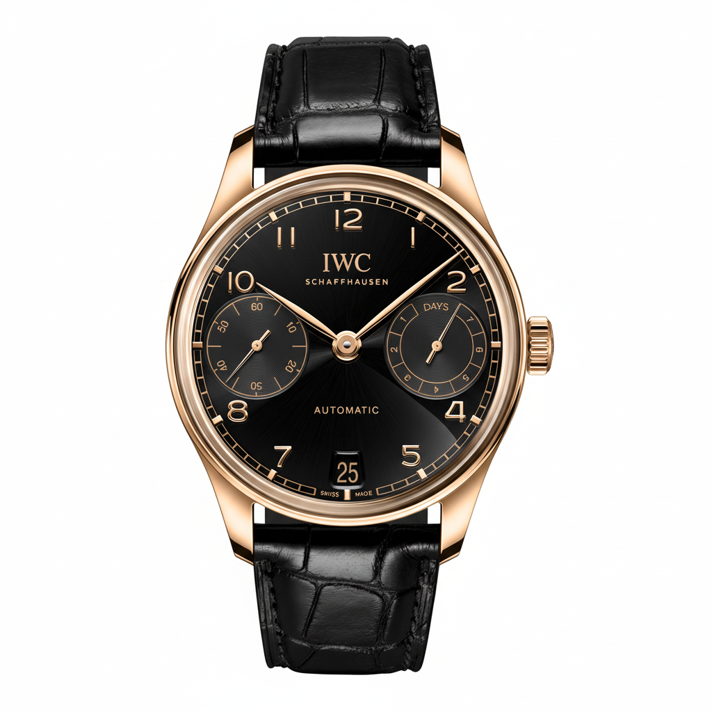The origins of the Portugieser date back to the late 1930s, when IWC Schaffhausen used a high-precision pocket watch movement to create a distinctively large wristwatch with chronometer precision. First introduced in 2000, the Portugieser Automatic 42 features an open, balanced dial, with a power reserve indicator at 3 o’clock and the small seconds positioned on the opposite side at 9 o’clock.