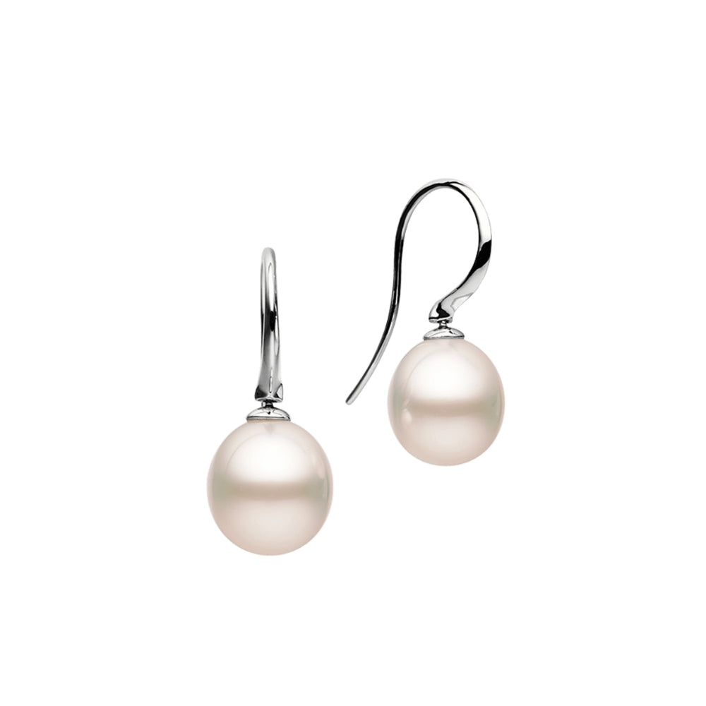 This contemporary style features two oval pearls set in white gold.Paspaley Keel Edge Shepherd Hook Earrings featuring 2, 11mm oval Australian South Sea pearls in 18K white gold.