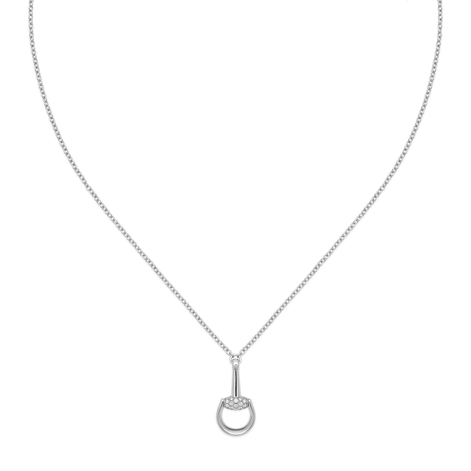 An extension of the Horsebit range includes eye-catching diamonds across a selection of white and rose gold jewelry pieces. This 18k white gold necklace features pavé diamonds atop a Horsebit pendant.