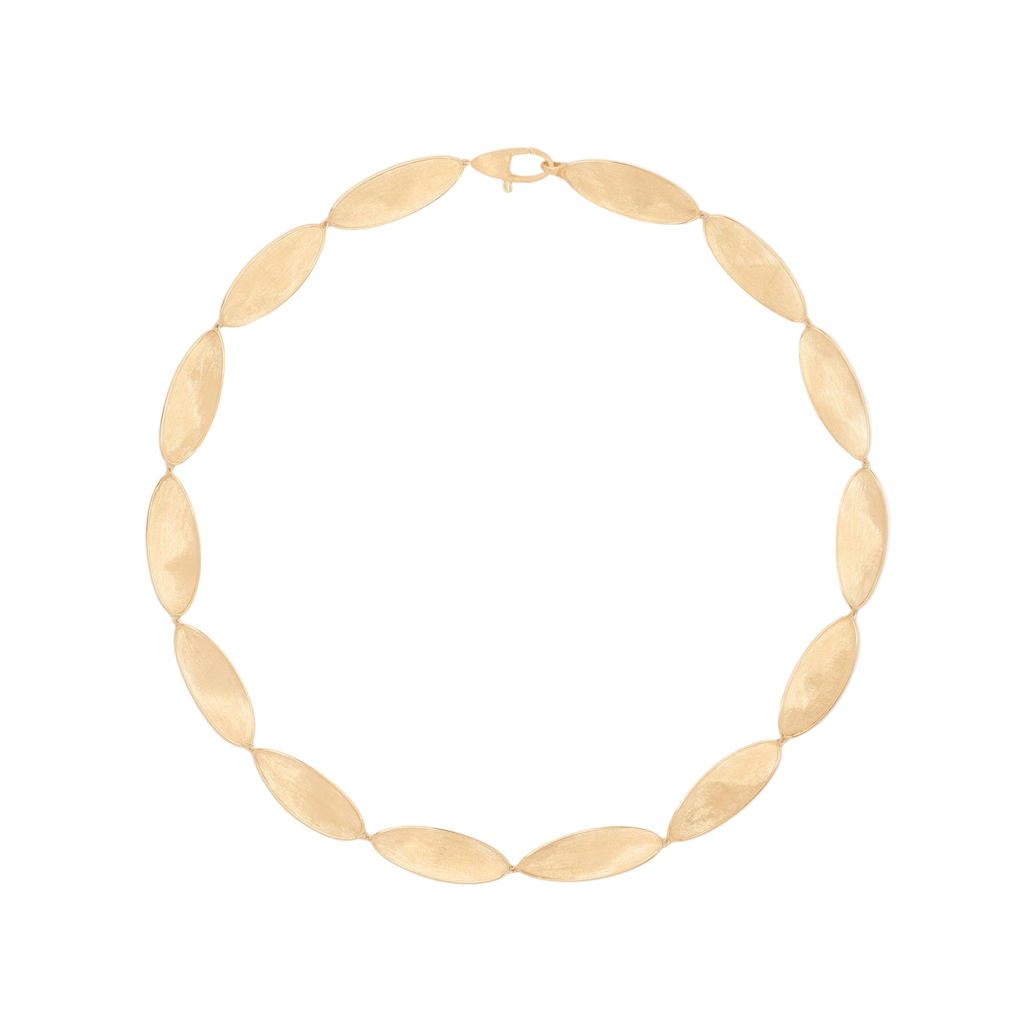 A striking interpretation of the iconic Lunaria motif, this 18K yellow gold necklace features irregular, twisted leaves with hand-engraved surfaces. Each element is sculpted using the ancient Florentine technique, capturing light and texture for a distinctive look that embodies natural elegance.