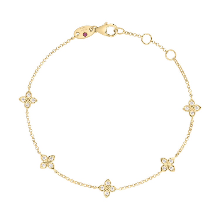 Part of the Diamonds by the Inch collection, this 18k yellow gold bracelet boasts five stations of Roberto Coin's signature Princess Flower design. With delicate chains and a glittering round brilliant diamond set in each petal, this bracelet exudes femininity— wear it solo or layered to create a fresh look.