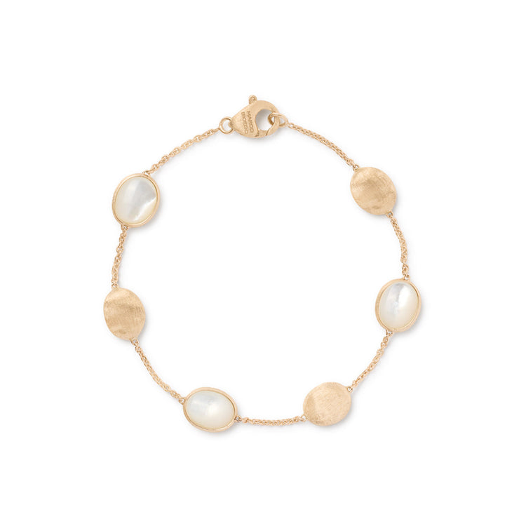 Elegant and timeless, this 18k yellow gold bracelet alternates thin chain links with oval elements with an irregular surface, finely hand-engraved using the ancient Florentine technique, and carefully selected white mother-of-pearls.