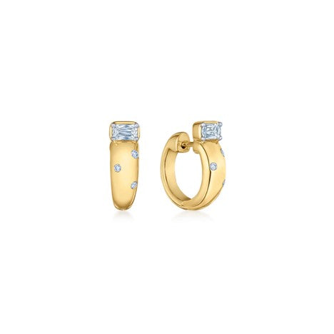 Kwiat Cobblestone Huggie Hoop Earrings in 18k yellow gold with 2 Ashoka Diamonds and 6 round diamonds weighing 0.56 carat weight.
