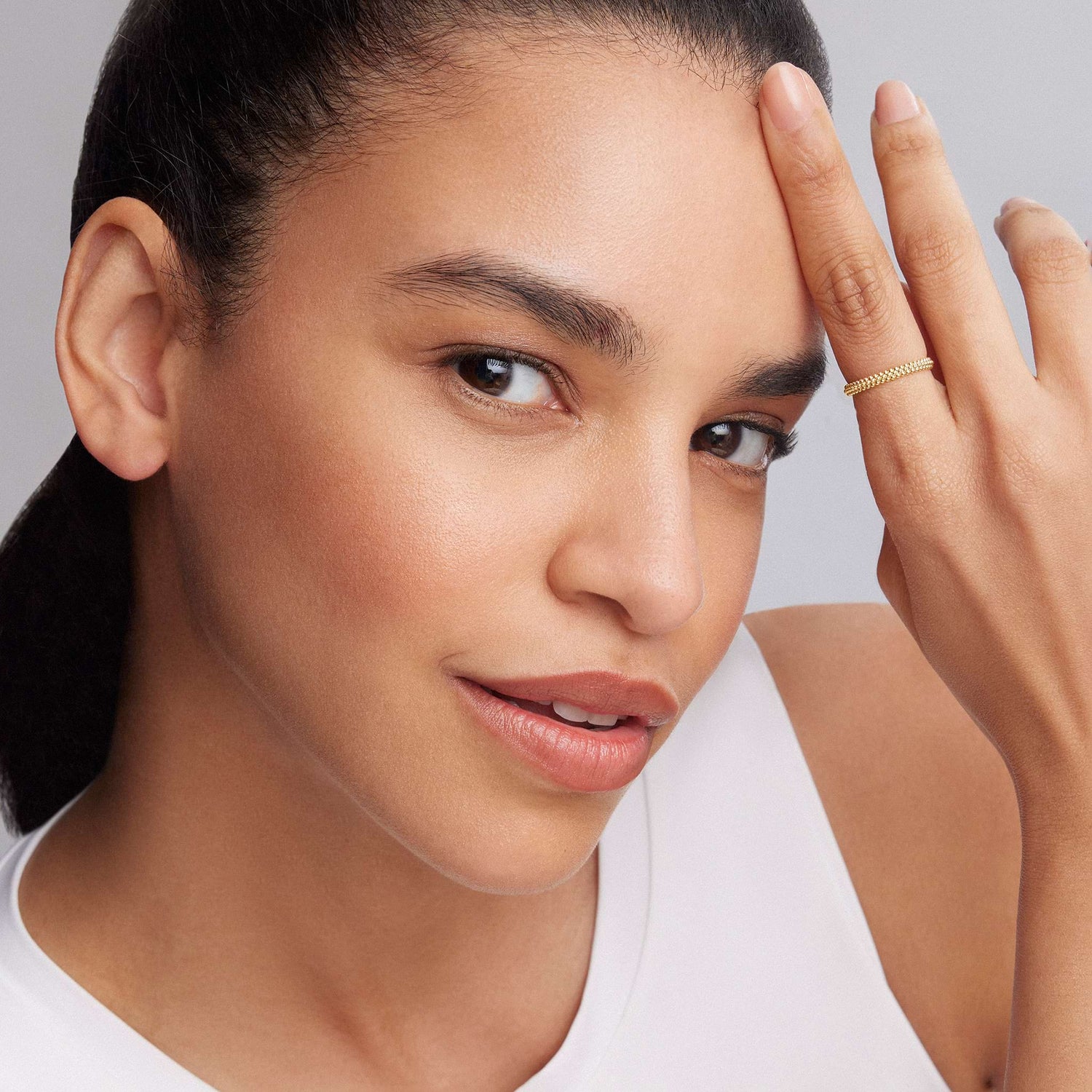 An 18K gold Caviar beaded stacking ring. Perfect to layer with other rings.