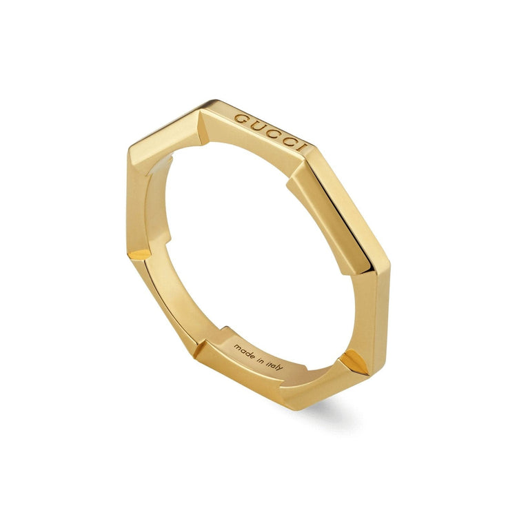 The Gucci Link to Love collection is an exploration of modern romance characterizing new symbols of love. The collection combines different gold tones and a mix of finishes blending the lines between masculine and feminine. Each piece is meant to inspire individualized ways to wear them with stackable and layered features. This 18k yellow gold mirrored ring has a stackable mechanism.