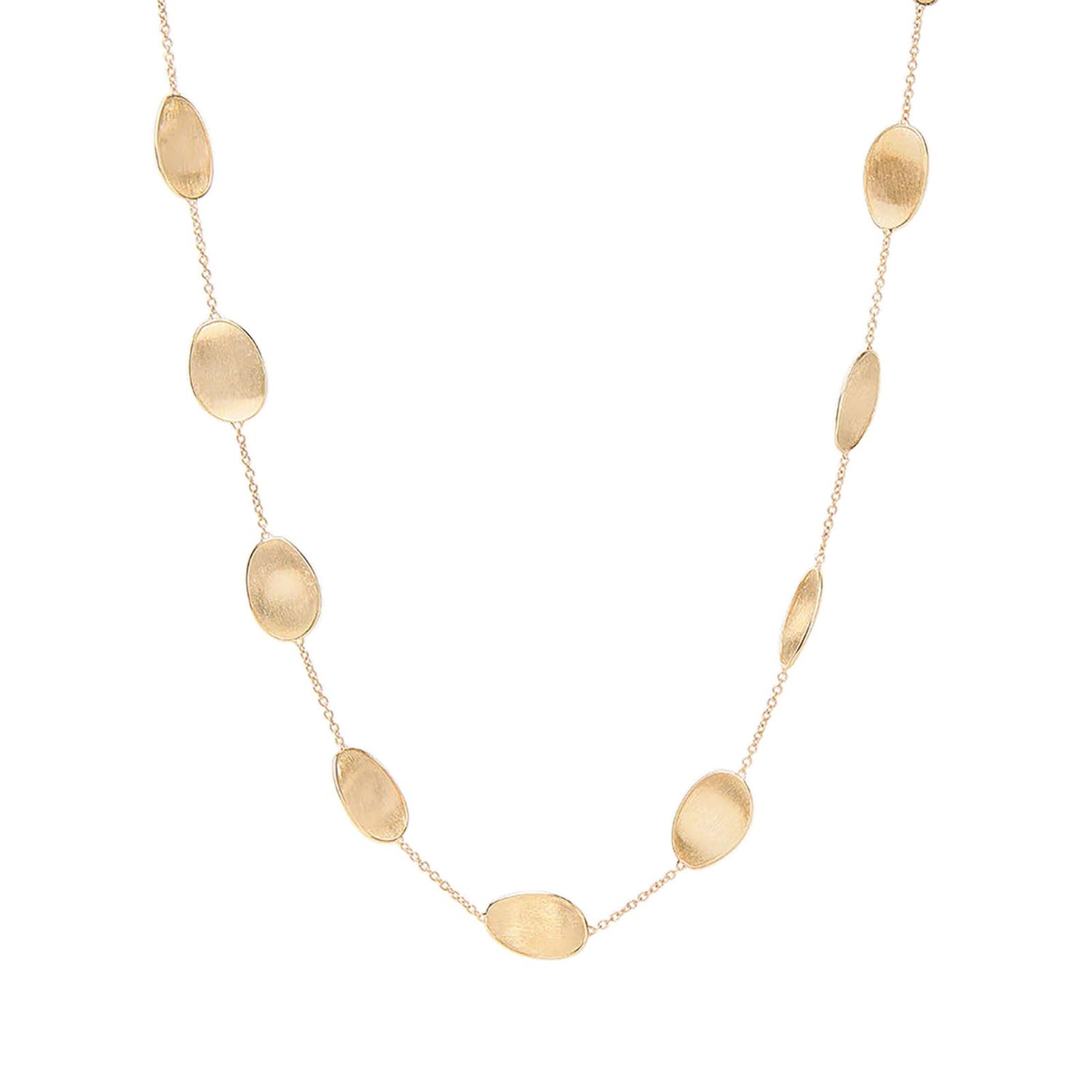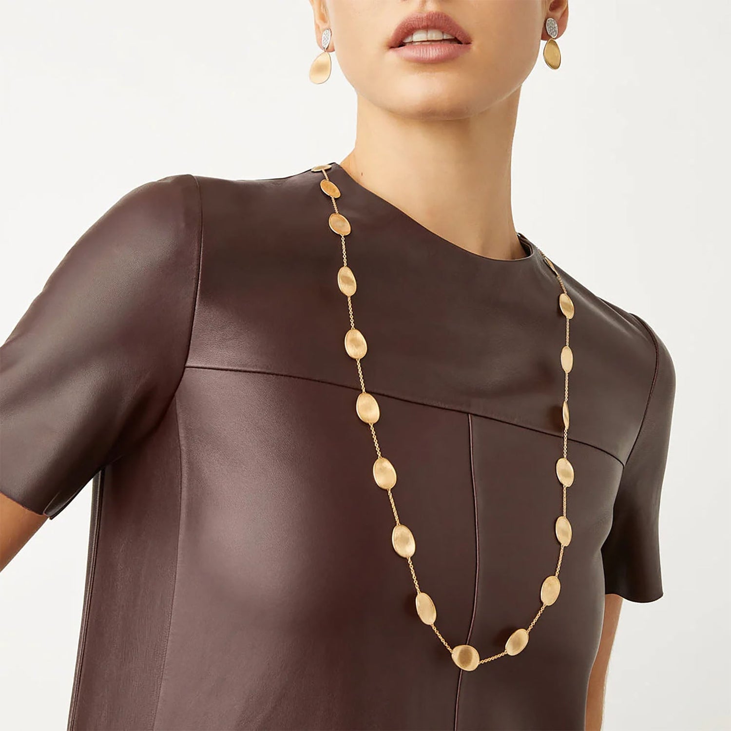 This long, minimalist necklace includes a regular sequence of light 18k yellow gold leaves, finely hand-engraved using an ancient Florentine technique, alternated with a slender chain. Perfect for every occasion, also when worn doubled.