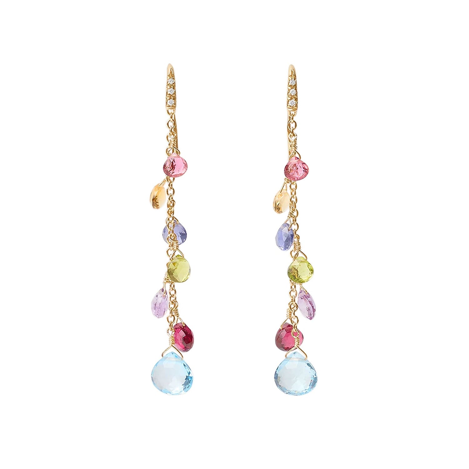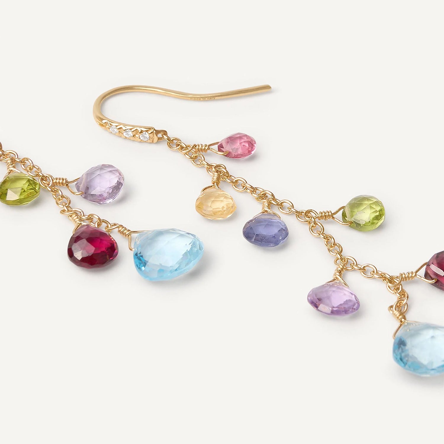 This elegantly understated pendant earring features a cascade of multicolored heart-cut gemstones. A real must-have, it is embellished by a precious hook studded with brilliant-cut diamonds.