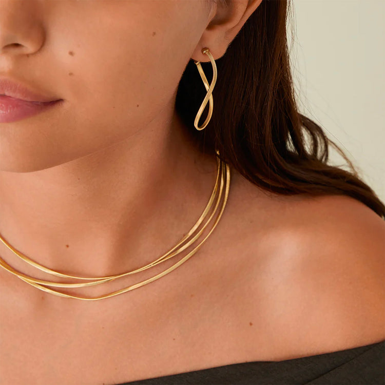 Subtle, elegant and full of finesse, these 18k yellow gold large hoop earrings feature a striking twisted coil into an irregular infinity shaped hoop. Light and refined, they are a timeless classic, perfect for adding a touch of light to any outfit.