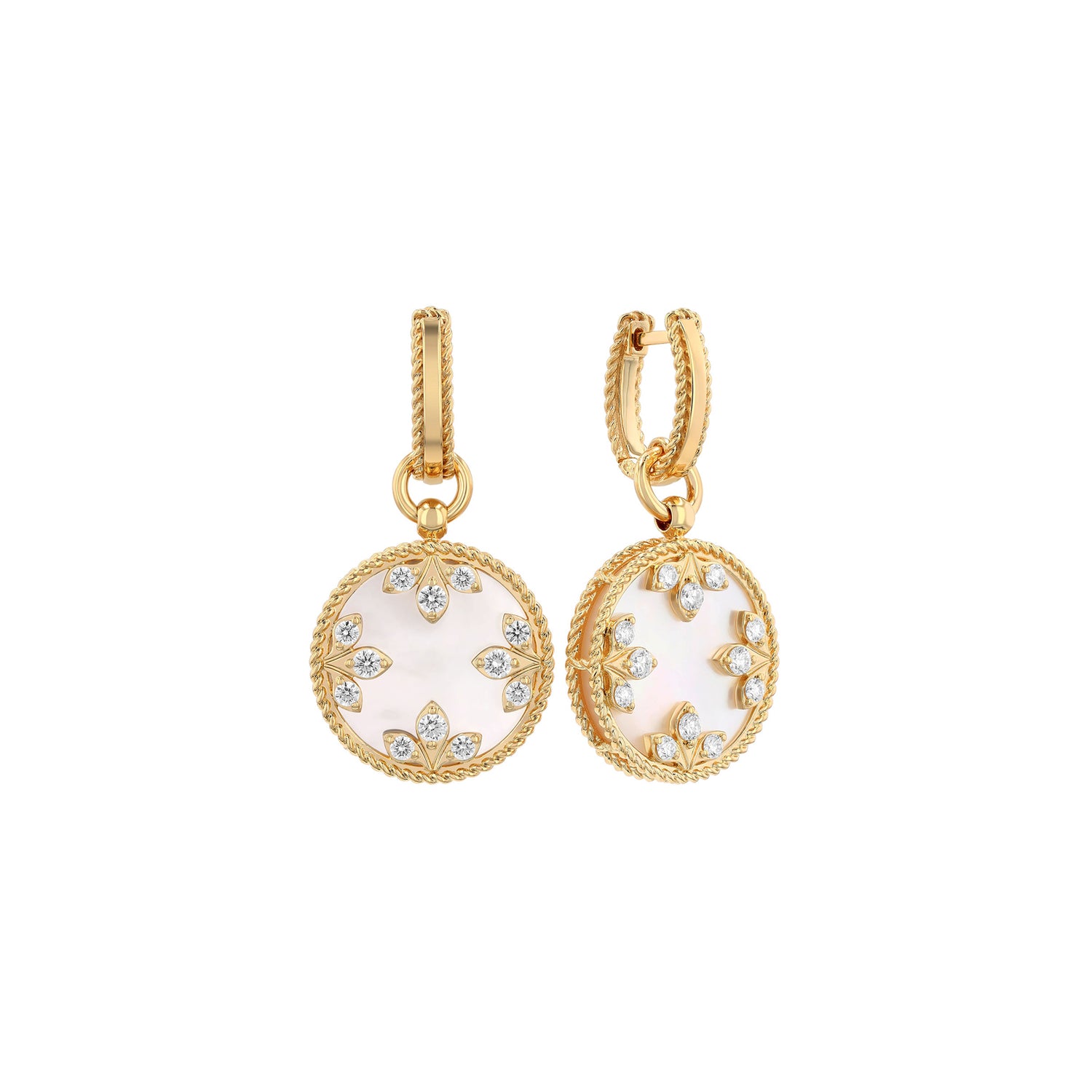Elevate your style with the Roberto Coin Diamond & Mother of Pearl Circle Dangle Hoop Earrings in Yellow Gold. These 18K yellow gold earrings showcase radiant mother of pearl and sparkling diamond accents, embodying an effortless, timeless luxury.