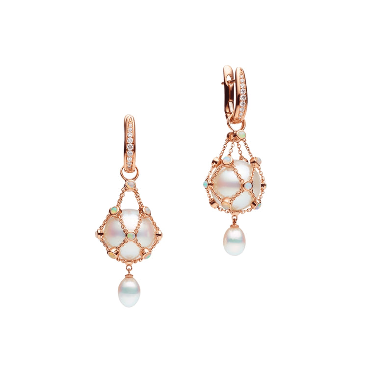Paspaley Lavalier earrings featuring two loose 12mm Paspaley Australian South Sea Round Pearls encased in 18K rose gold with 28 Australian white crystal opals (0.85ct) and 18 white diamonds (0.20ct), and two 5mm Paspaley Australian South Sea Keshi Pearls.