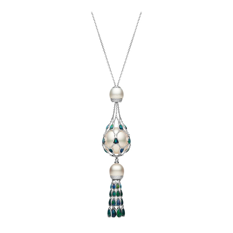 Hero Lavalier necklace combines white gold, sparkling diamonds and luminous black opals.Paspaley Lavalier Necklace in 750 White Gold with 2 8-10mm Drop Australian South Sea Pearls, 68 Black Opals (4.10ct), Mother of Pearl and 154 White Diamonds (0.95ct)Length adjustable (70- 80cm).