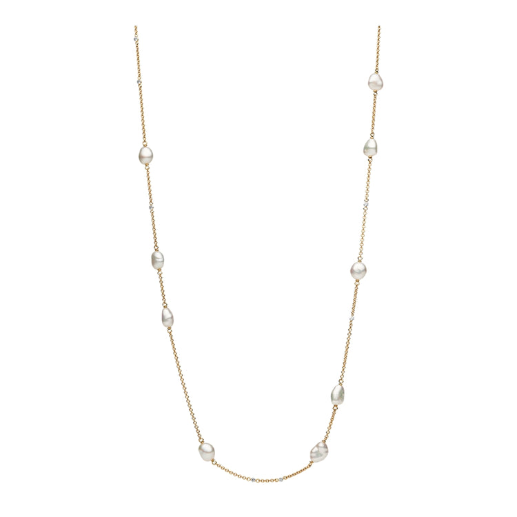Paspaley Rockpool chain in 18K yellow gold with 20 5mm Paspaley Australian South Sea Keshi Baroque Pearls and 18 white diamonds (0.44ct). This fine chain necklace is a timeless piece inspired by the raw beauty of nature. Length 34 IN.