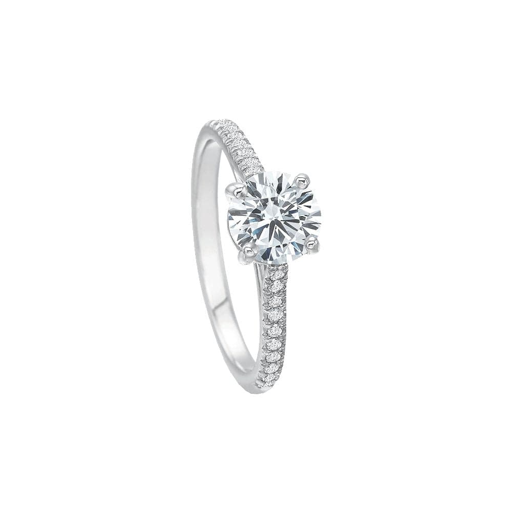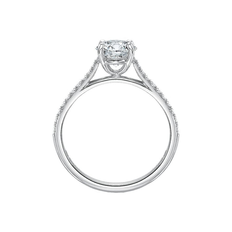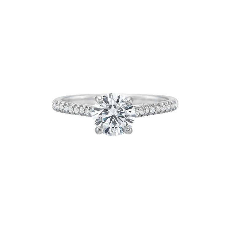 Precision Set's New Aire Semi Mount Ring has a shank crafted from 18k white gold with round brilliant diamonds set half way around. The four prong head is made of platinum and waiting for your unique center stone as the finishing touch.