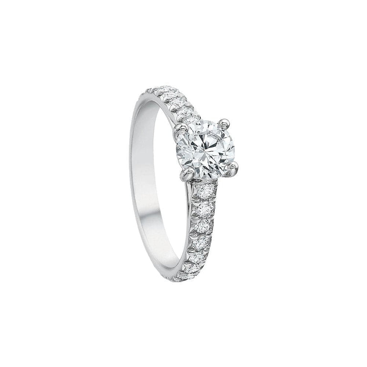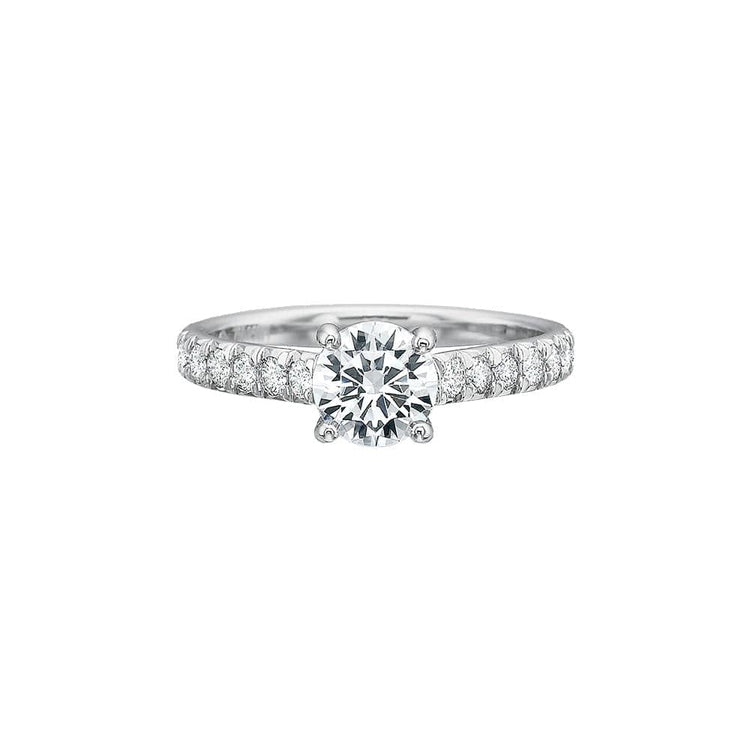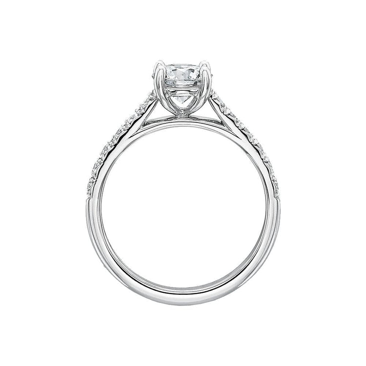 Precision Set's New Aire Semi Mount Ring has a shank crafted from 18k white gold with round brilliant diamonds set half way around. The four prong head is made of platinum and waiting for your unique center stone as the finishing touch.