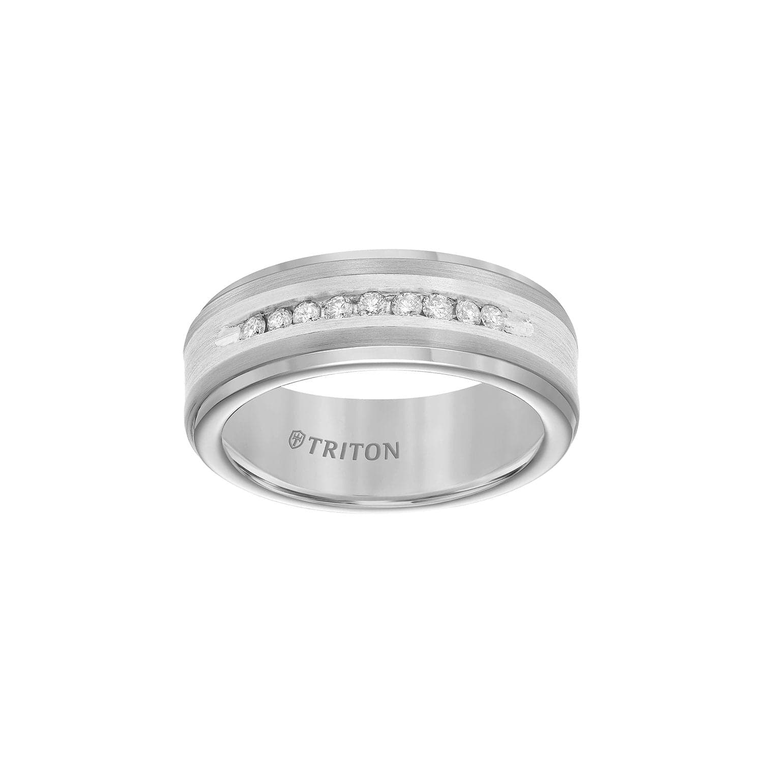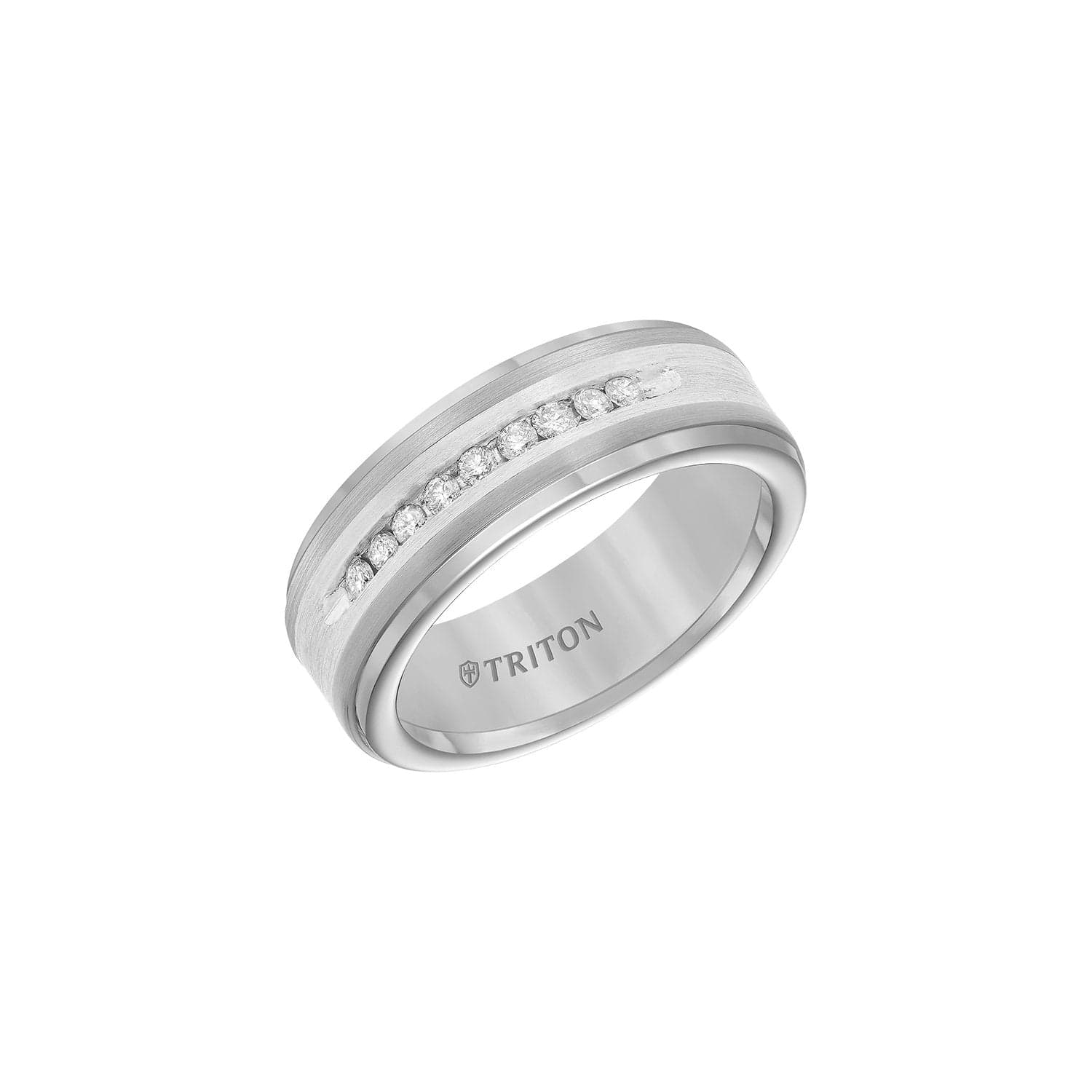 Crafted from polished tungsten carbide with round brilliant diamonds set in a sterling silver inlay with a satin finish.