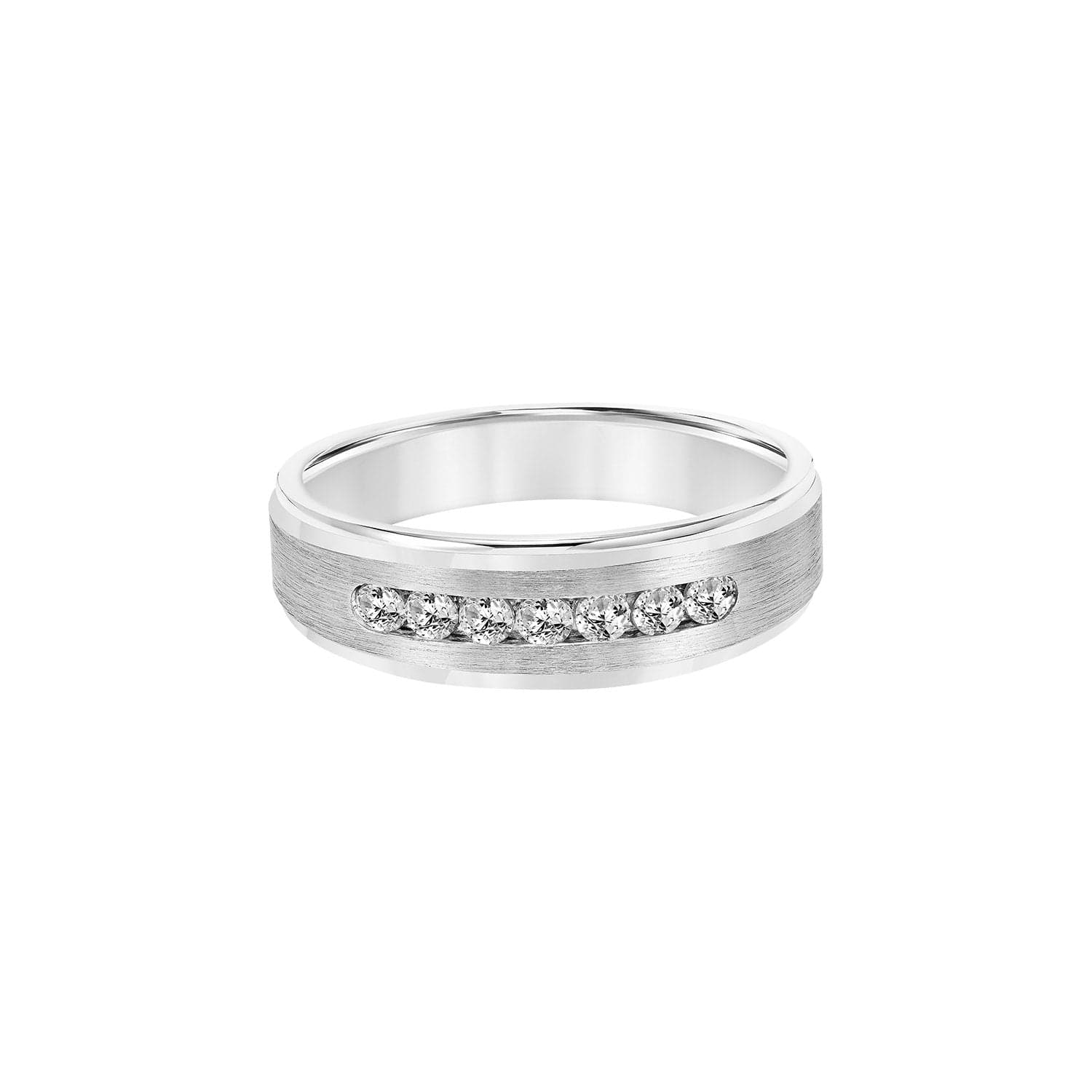 Crafted from 14k white gold, Goldman's tapered domed profile band is set with seven round brilliant diamonds in a brushed center, accented with polished round edges.