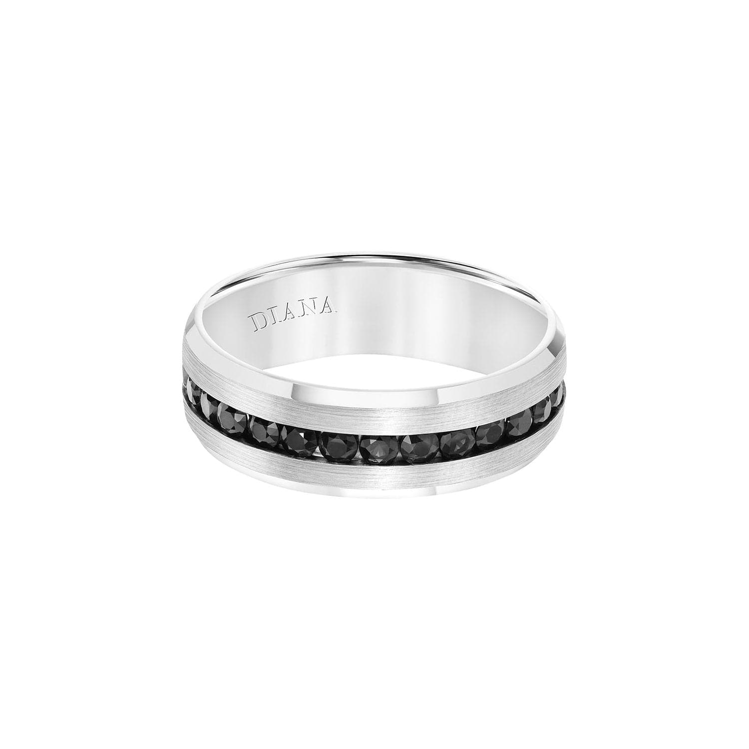 Crafted from14k white gold and set with black sapphire rounds, this comfort fit Diana Goldman band is a bold twist on a classic style.