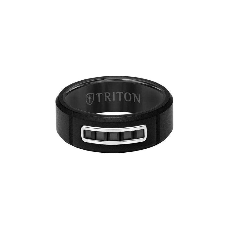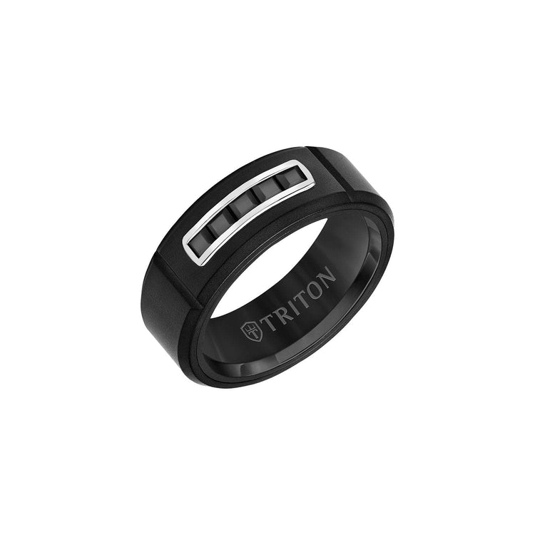 Triton's 8mm Band is crafted from textured black tungsten with a polished black ceramic interior and set with five princess cut black sapphires within a silvery ceramic inlay.