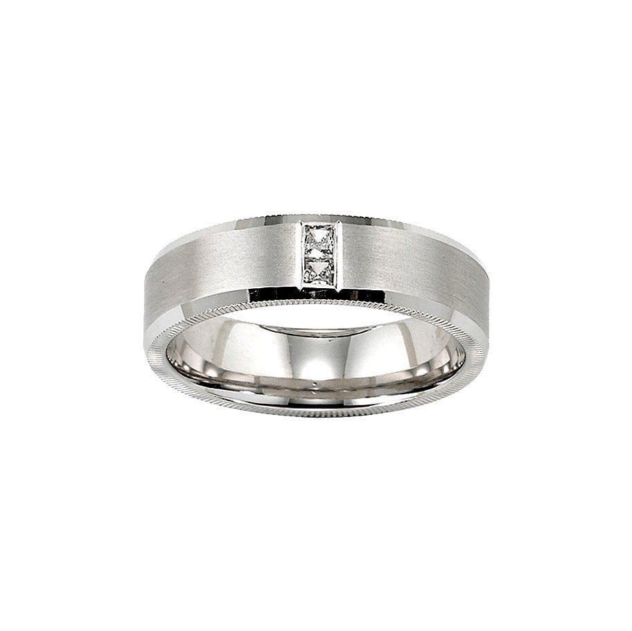 Crafted from 14k white gold and set with two princess cut diamonds, Artcarved's Dumont band is a modern classic.