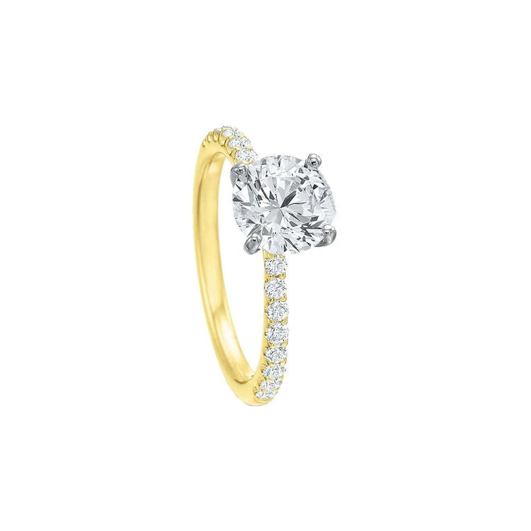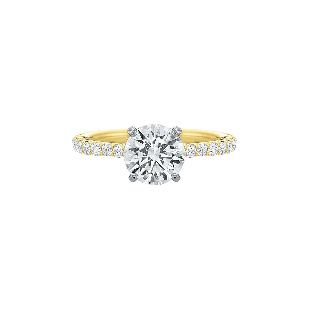Precision Set's New Aire Low Profile Semi Mount Ring has a shank crafted from 18k yellow gold with round brilliant diamonds set half way around. The four prong head is made of platinum and waiting for your unique center stone as the finishing touch.