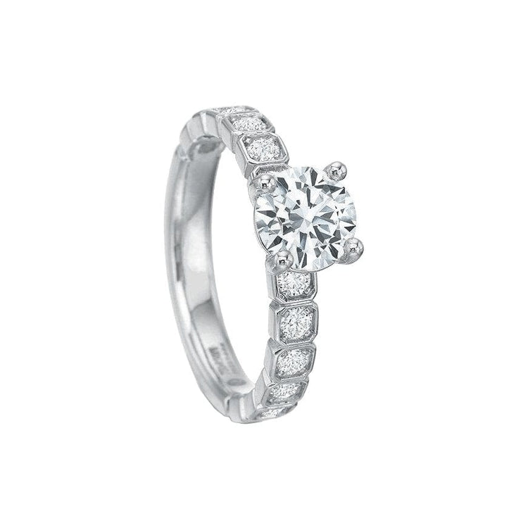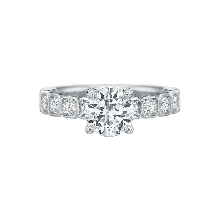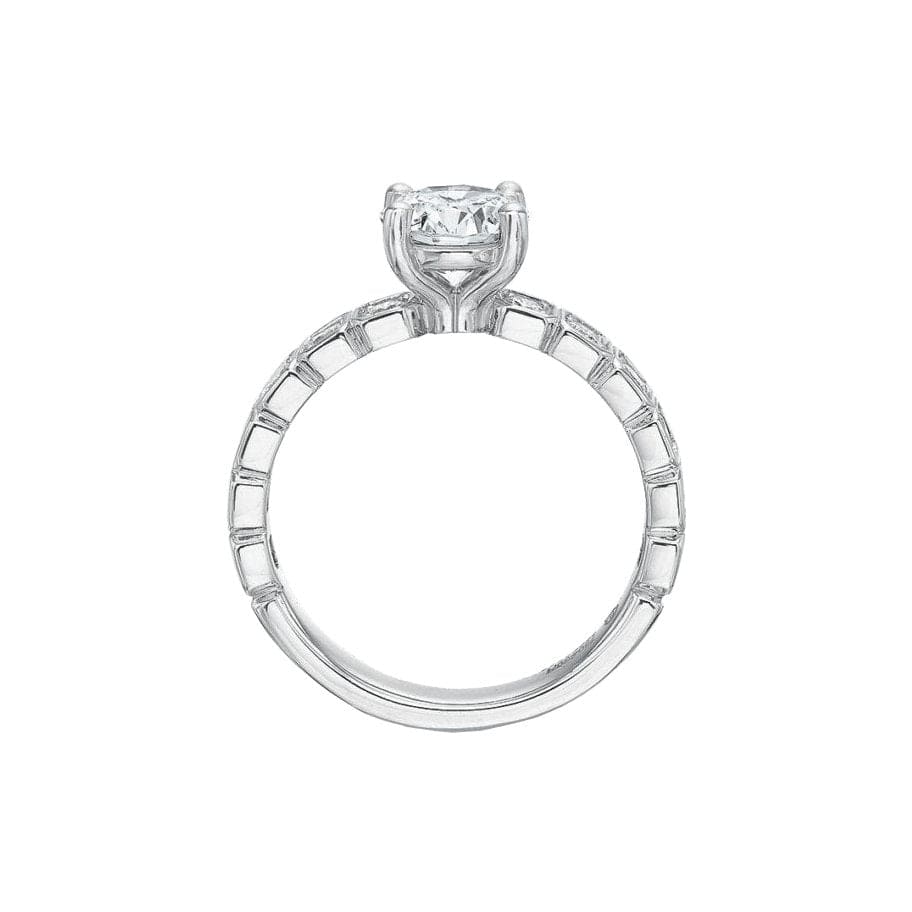 Precision Set's Modern Classic Semi Mount Ring has a shank crafted from 18k white gold with round brilliant diamonds set in square bezels. The four prong head is made from platinum and embellished with milgrain trim and set with round brilliant diamonds.