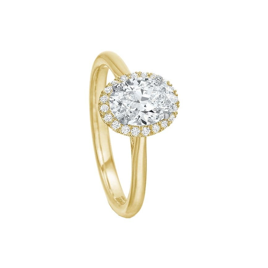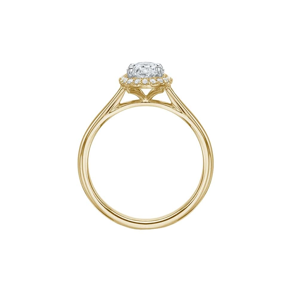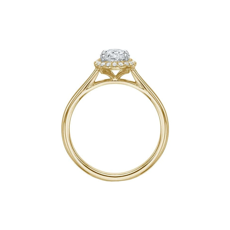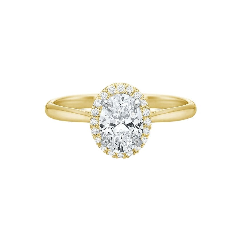 Precision Set's Oval New Aire Halo Semi Mount Ring is crafted from 18k yellow gold with white gold prong accents. The center stone is accentuated with an oval shaped halo set with round brilliant diamonds.