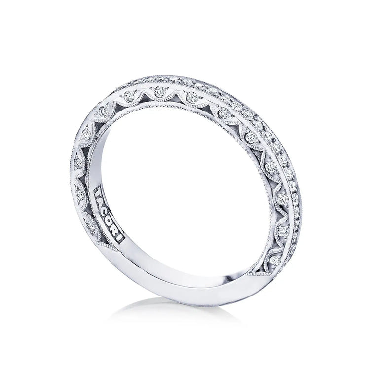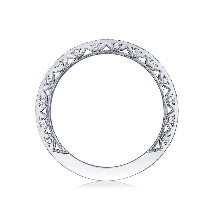 Pave-set round-brilliant diamonds glitter in 18k white gold, while more diamonds gracefully decorate the inner face silhouette. Windows of light are formed by Classic Crescent fabric.