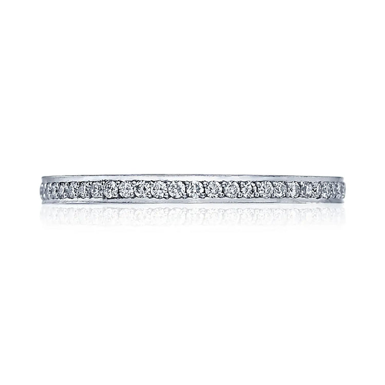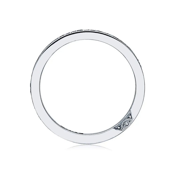 A meticulous string of petite round-brilliant diamonds traces the perimeter, while a clean, 1.8 mm. band of premium metal creates a contemporary aesthetic. A diamond-studded signature crescent marks the resting point of the ring.