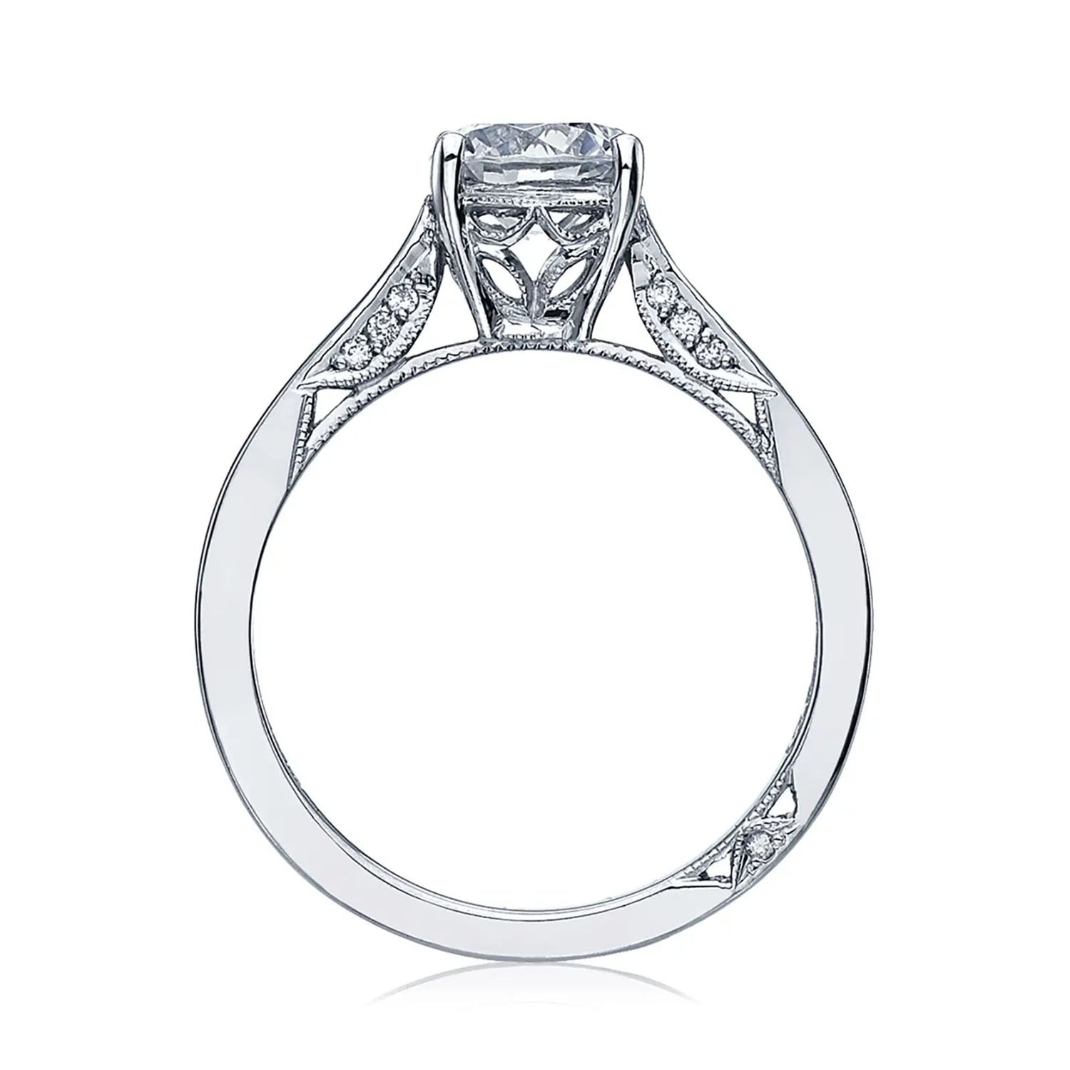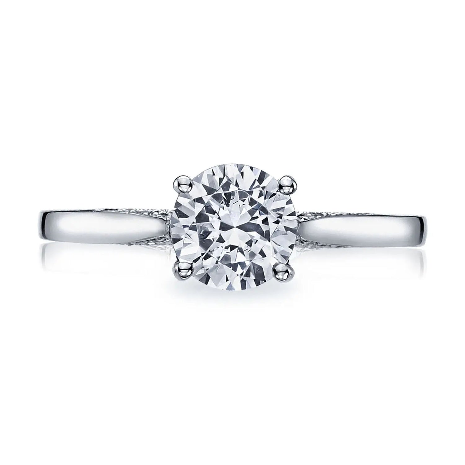 A round-brilliant solitaire is enhanced by lace-like milgrain detailing on the Cathedral foundation. These intricacies are smartly juxtaposed by a high-shine band which is marked with a signature crescent at the resting point.