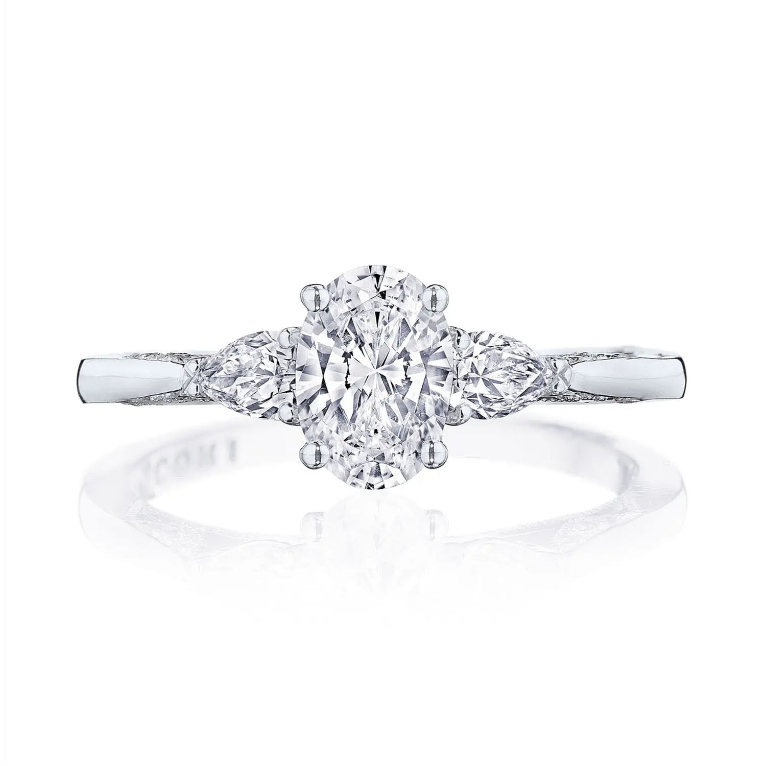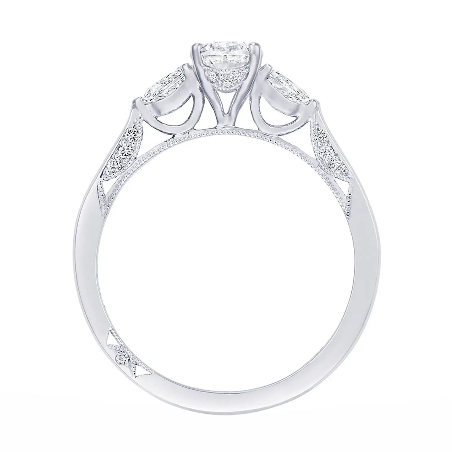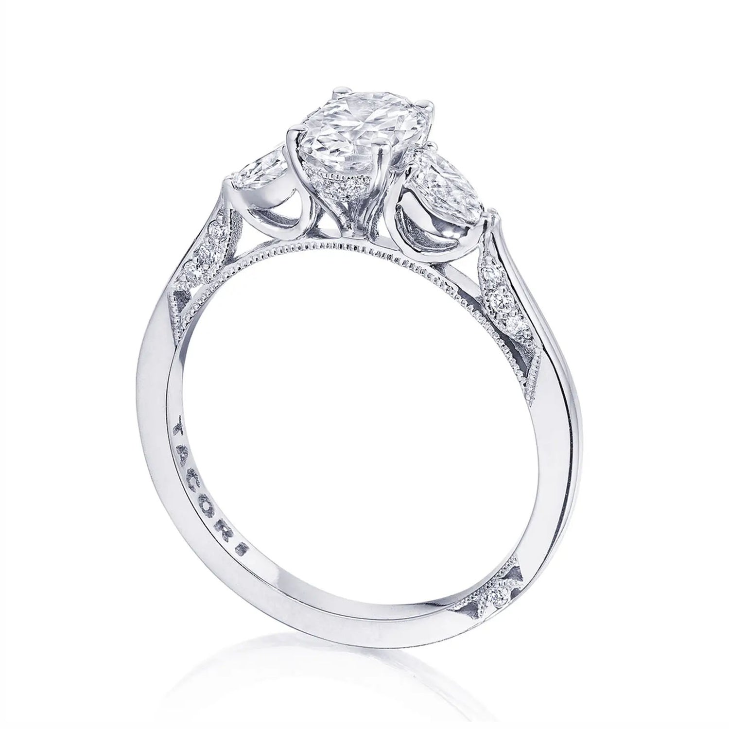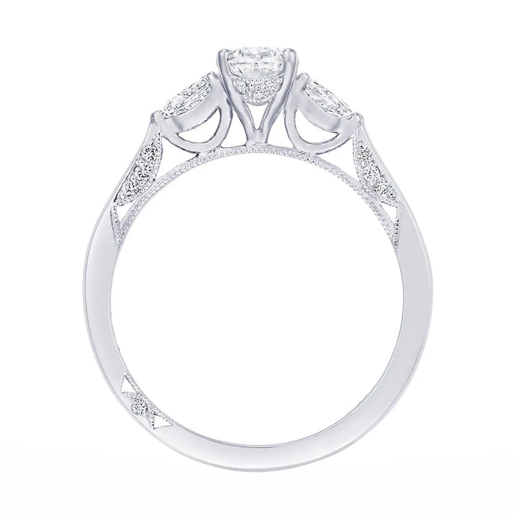 Two pear side stones accentuate the center stone, which sits on a Cathedral foundation with a hidden bloom. Simply Tacori crescent fabric adds diamond detail to the inner face and complements the high-polish band.